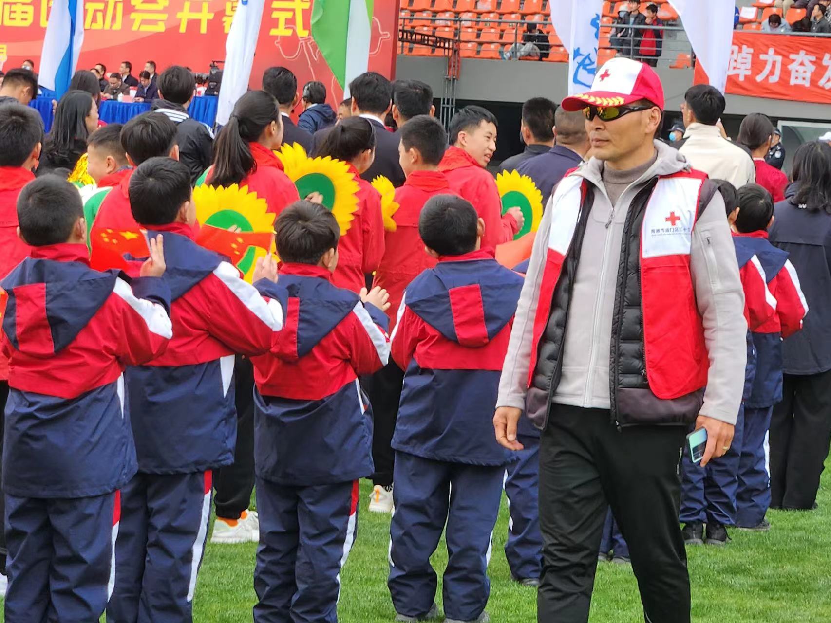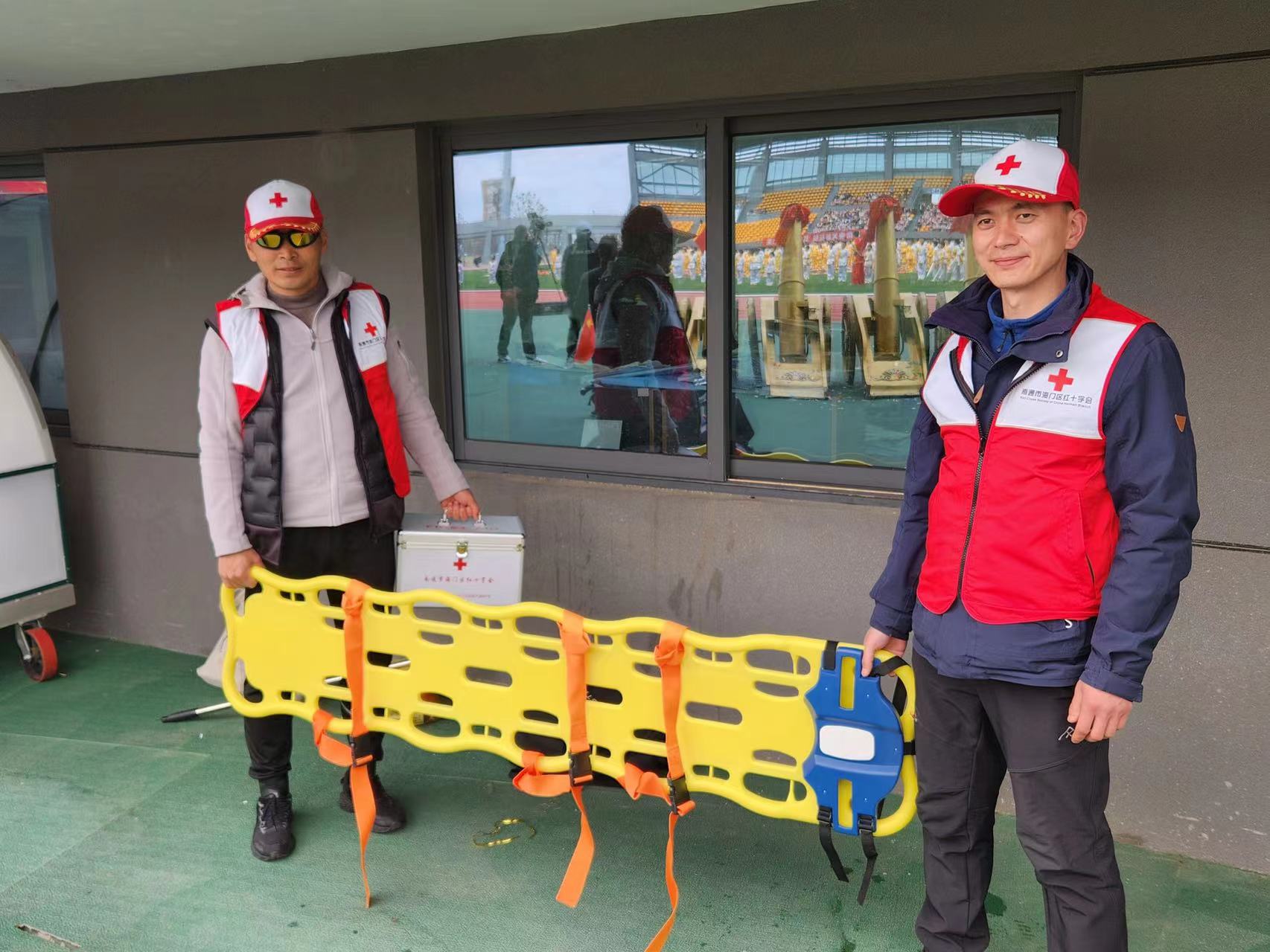 区红十字会为开幕式会场配备AED(自动体外除颤仪),折叠式担架,绷带、卷式夹板等急救用品,并组织区红十字会赈济救援队4名队员,为运动员和观众提供应急救护保障、应急救护培训等服务。志愿者们一直处于待命状态,身着红十字马甲的身影穿梭在运动场内,随时准备着为需要帮助的运动员们提供服务。一名运动员体力透支摔倒,红十字志愿者第一时间应急应对,及时转运至120保障车内观察。