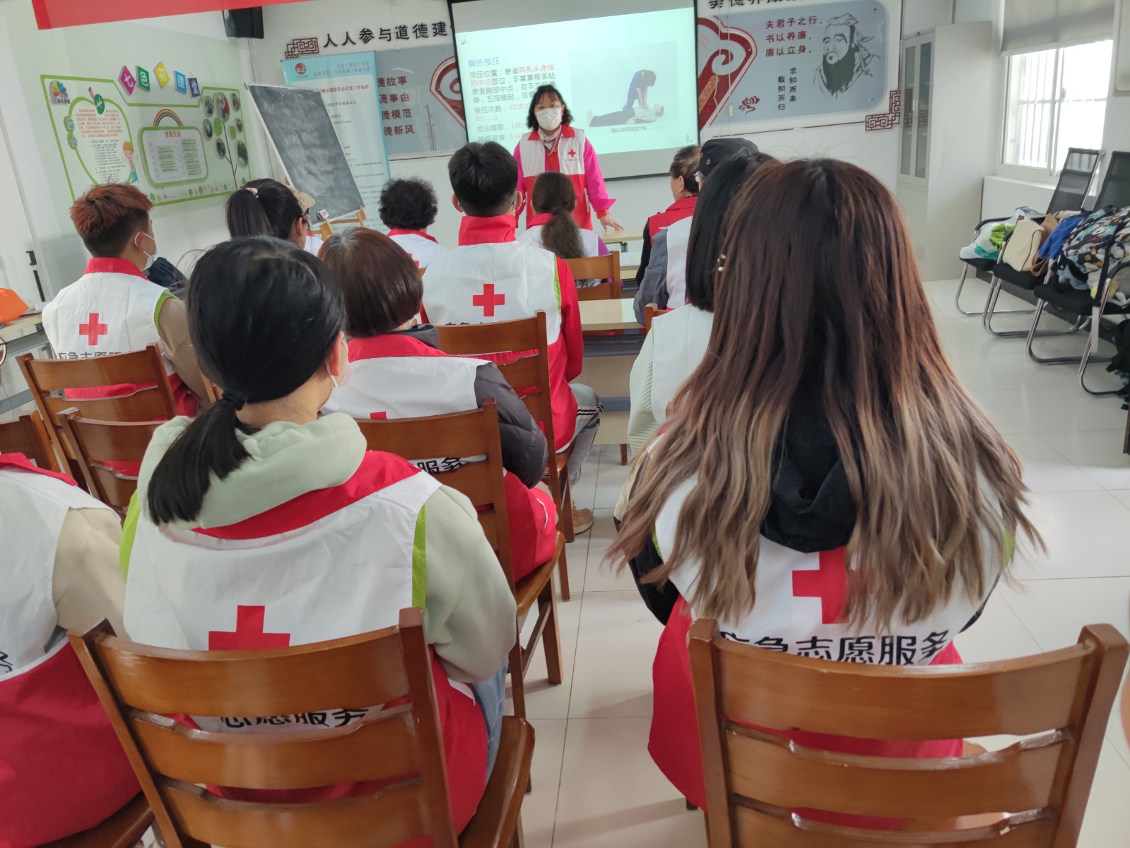社区二楼活动室内,老师通过大屏幕展示PPT图片、视频和动作示范为在座的队员们讲解心肺复苏术(CPR),先后演示了CPR的重要性、使用场景和操作要领。应急志愿服务队员们纷纷表示,面对突发事故、意外伤害时,能更从容不迫地进行现场处置,减少意外带来的伤害,同时也要把新技能教给身边的朋友,让更多人加入应急志愿服务的队伍中来。