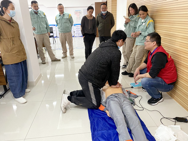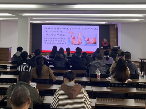 培训中,蔡讲师从红十字运动基本知识、救护概论、心肺复苏、创伤救护、常见急症、意外伤害、突发事件七个方面详细讲解了应急救护知识和基本技能。他采用理论和实践相结合的方式,利用视频案例和图文资料,细致生动地讲解了CPR的专业知识,并且借助模拟人进行示范演示,使学员们很快地理解并掌握了相关知识。