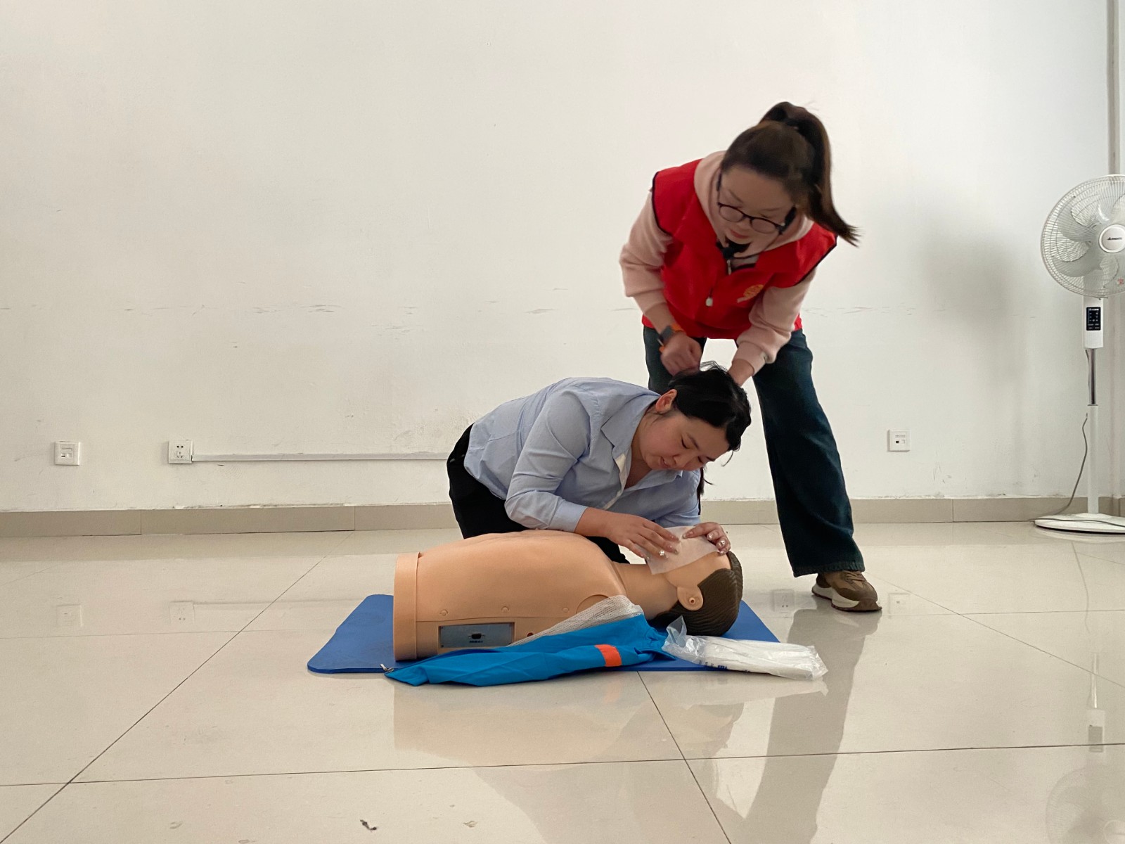 救护培训老师杨静以基地学员突然昏倒为例,引入心肺复苏术的理论知识和操作技巧、自动体外除颤器(AED)的配合使用说明,重点强调高质量心肺复苏的要点。在操作环节帮助学员们熟悉每一个操作环节,巩固操作技能。