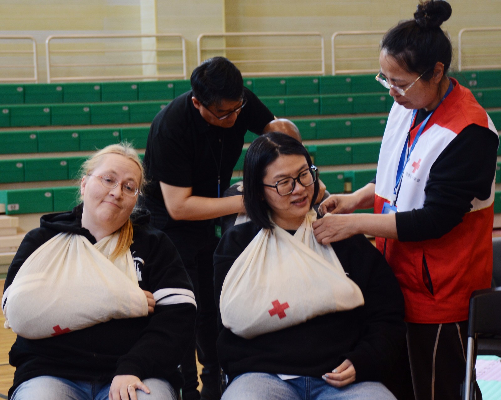 救护老师首先宣传了国际国内红十字精神和相关知识,让外籍教师更好地了解中国的红十字会。接着通过精彩的现场话剧情景表演,就常见中暑、晕厥等急症的救护与处理、气道异物梗阻的救护、以及突发的创伤处置方法等进行了详细的讲解和示范。学员们熟练掌握了心肺复苏(CPR)操作和除颤仪(AED)使用,在随后的练习考核中全员顺利过关了,有的还考出了满分的成绩。