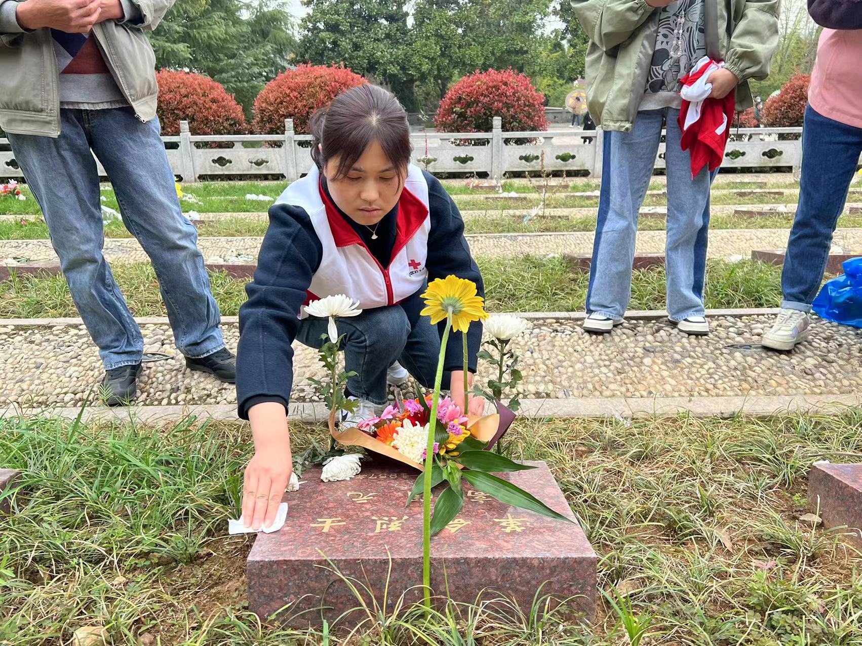缅怀先烈英雄事,热泪盈眶祭英魂。高高耸立的革命烈士纪念碑显得格外肃穆,在纪念碑前,全体成员通过鞠躬、默哀、献花等方式表达他们对烈士的深切哀悼和崇高敬意。随后,志愿者带领大家游览并详细介绍烈士陵园的文化历史、纪念碑上图案含义等,犹如回到战火纷飞的年代,大家亲身感受到了先烈们为保家卫国而艰苦奋战的热血。红十字志愿者任玲玲说:“没有革命先烈的流血牺牲,就没有我们今天的幸福生活。他们有的人年纪轻轻就献出了生命,有的人甚至连姓名也没留下,为他们擦拭墓碑,我感到很荣幸。”与此同时,参加祭扫的志愿者们纷纷表示:我们要以革命先烈为榜样,学习他们勇于拼搏的精神,为国家美好的明天贡献力量。