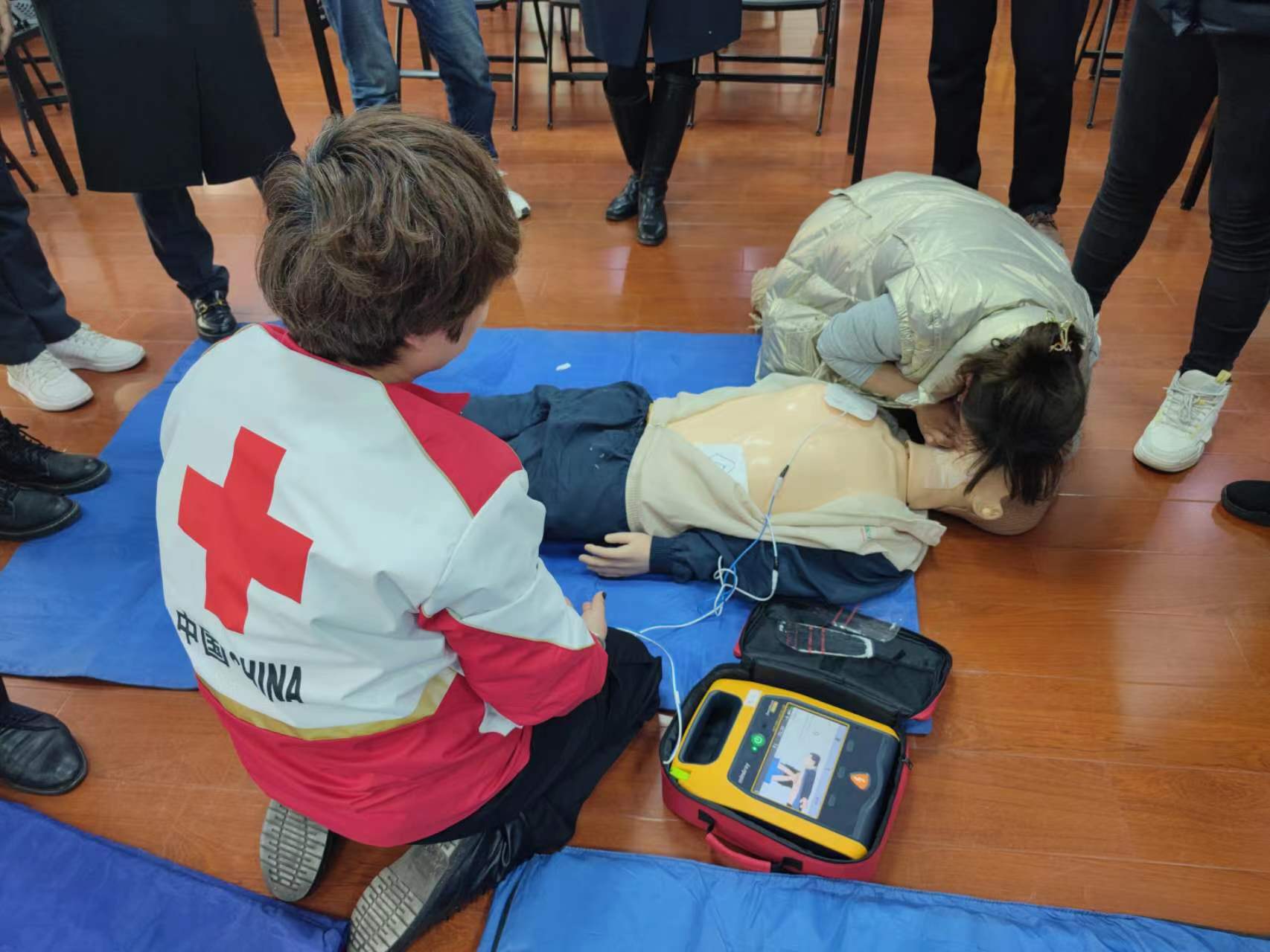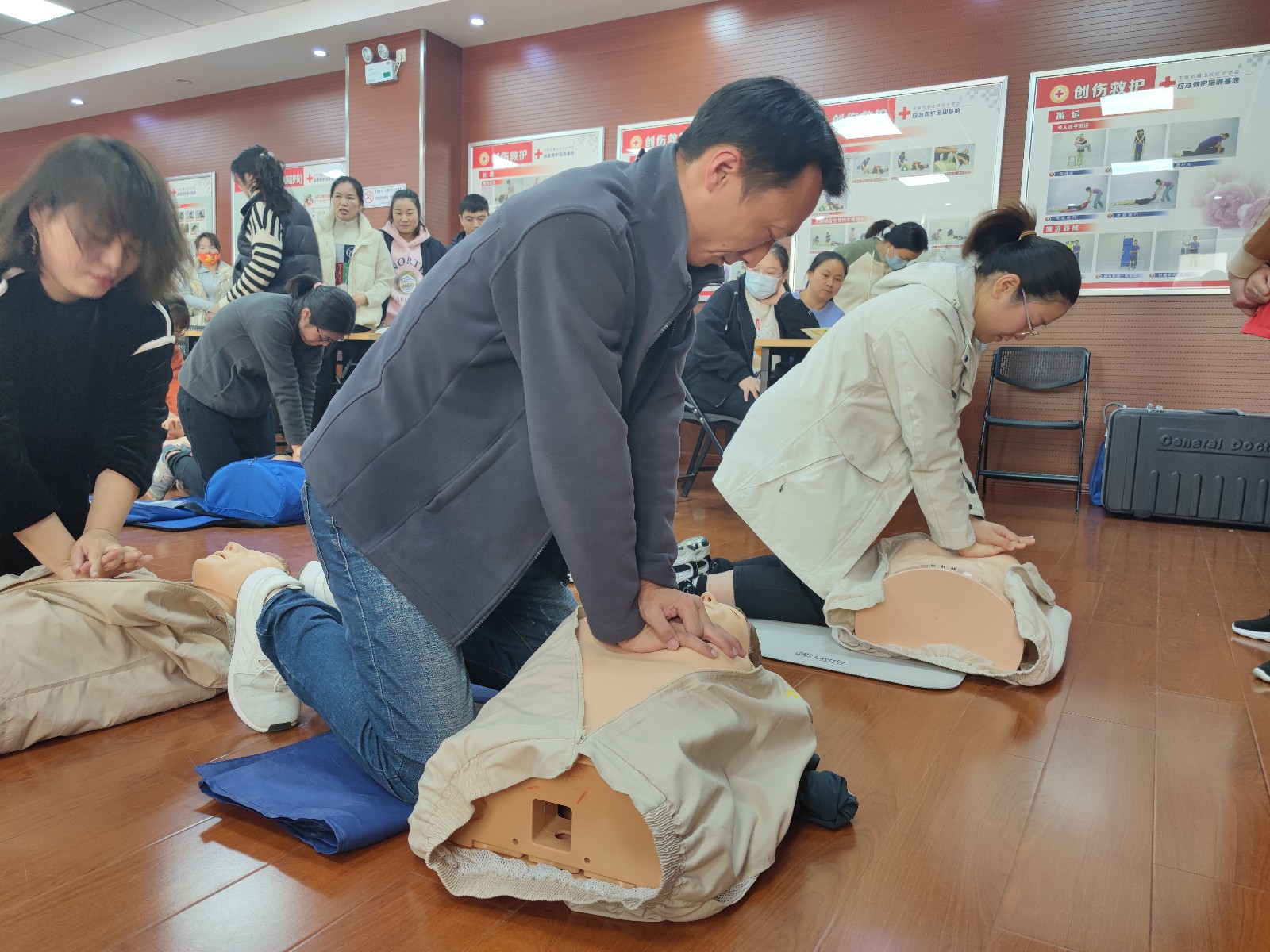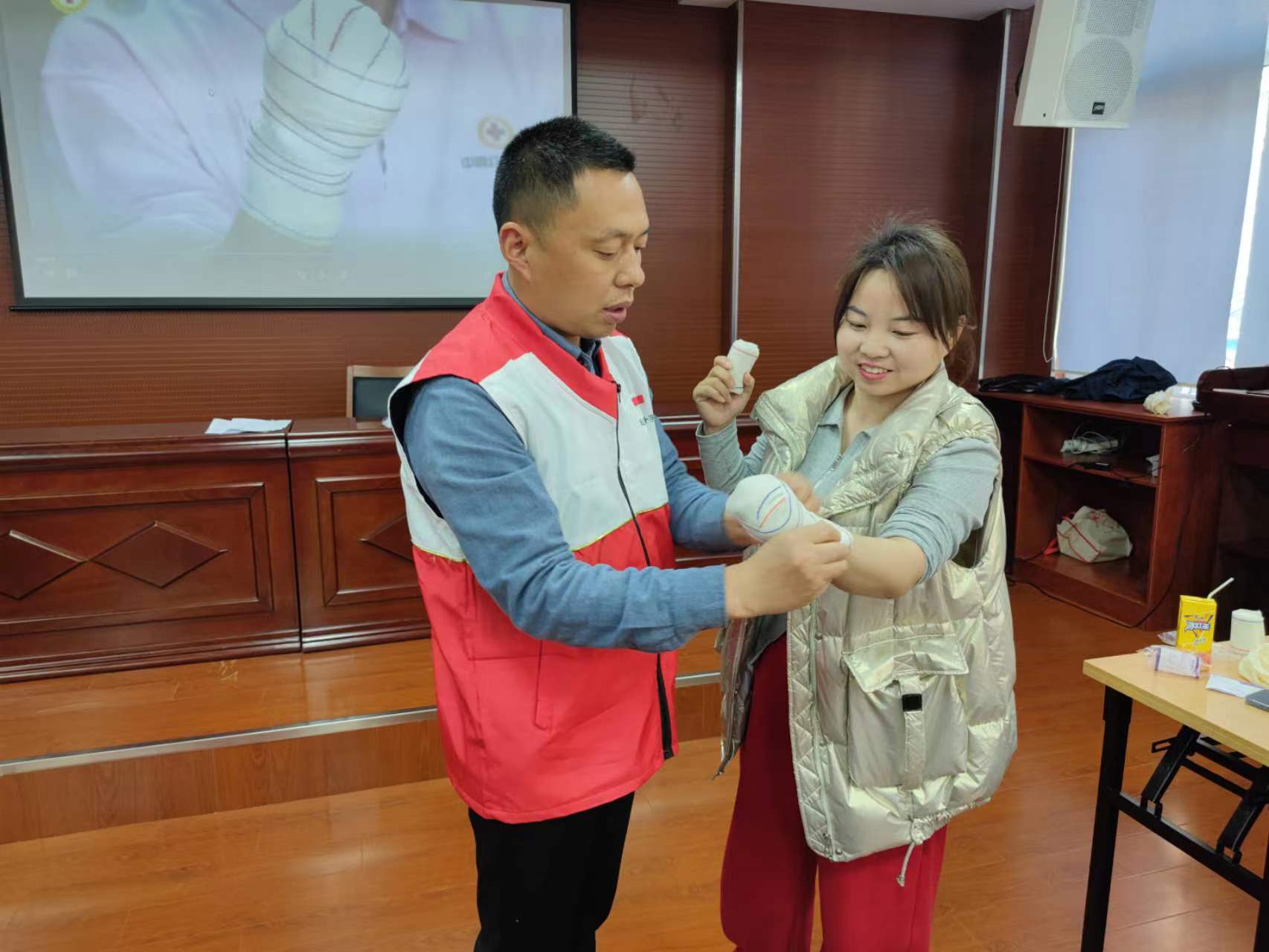 本次培训采取“理论+实践”的方式。课堂上,红十字会甄老师详细介绍了我国应急救援现状,并向学员们分发了急救包和救护培训手册,以通俗易懂的语言带领学员们学习应急救护理论知识、心肺复苏和创伤救护操作等知识。为了加深学员们对理论知识的理解,甄老师在现场播放教学视频,并且亲自为大家示范了心肺复苏和包扎的手法及要领,让每一位学员都上前练习操作步骤,并及时指导纠正学员们操作有误或不妥之处。在反复练习操作过程中,学员之间相互演示、彼此评价并交流心得体会,现场气氛热烈。课程结束后,甄老师对每一位学员进行了严格的理论知识与实践操作考核。