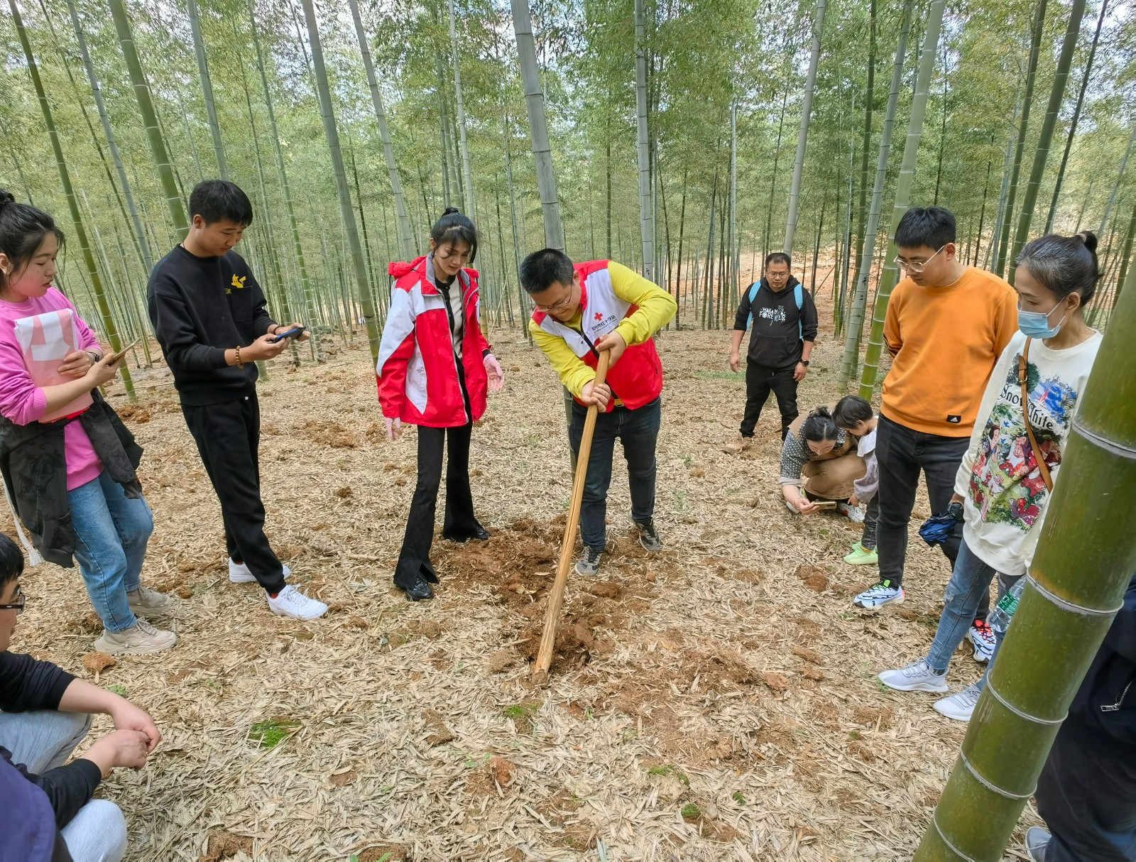 本次活动邀请到了来自南京的觅源带货团中20余名团长代表一同参与,在宜兴市红十字服务中心主任强静霞的带领下,宜小红志愿者们先后进行了挖笋、乌米饭制作、参观制茶过程等体验。志愿者们来到张渚深山之中,一群“红马甲”时而弯腰、时而起身,他们手拿锄头,挖竹笋、剔叶子、装麻袋,动作娴熟,一个个竹笋在他们面前堆成小山,在田间地头一片繁忙的景象……几位带货团的团长挖笋之余不忘拍摄记录,筹划直播带货,指导当地村民如何进行线上推广,真正实现了从授人以鱼到授人以渔,向广大消费者推荐这来自张渚山林间的人间美味。