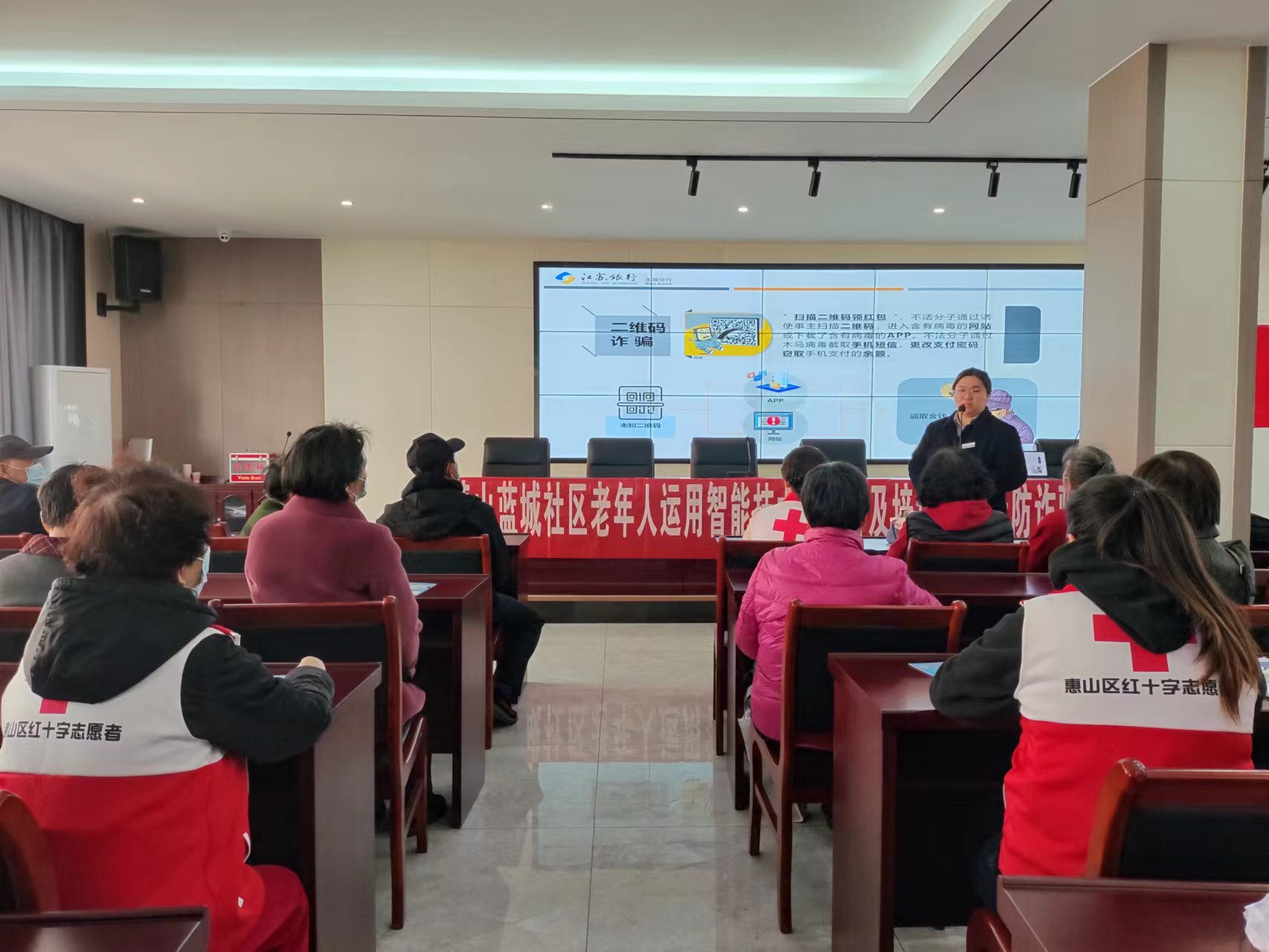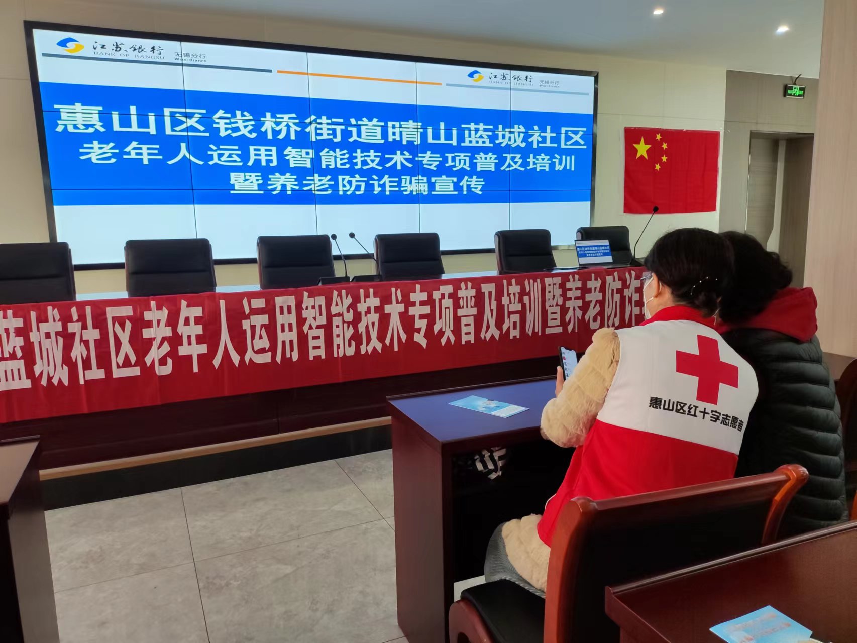 近日,惠山区钱桥街道晴山蓝城社区特邀江苏银行专职人员,组织开展老年人智能手机功能运用暨养老防诈骗宣传活动。博爱家园红十字会志愿者也积极参与此次培训,并在现场进行智能手机运用技术指导暨防止网络诈骗的宣传。