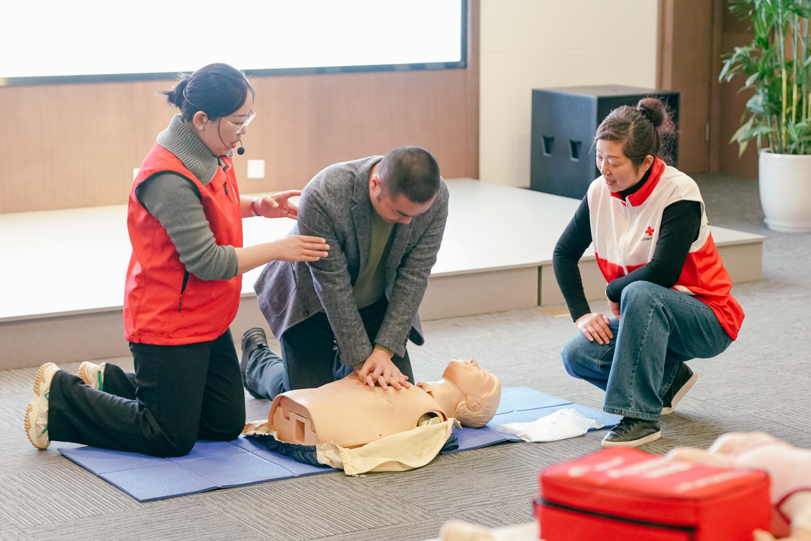 培训现场,亭湖区红十字会志愿者讲师全面介绍应急救护的基本知识,详细讲解了心肺复苏术的操作步骤和要领、 AED的使用方法,并通过模拟演示,全面展现面对突发情况的救助流程和急救技能。参训人员轮流进行实际操作,培训讲师对大家操作中不规范、不到位的动作进行一对一纠正、指导,确保大家掌握关键要点。