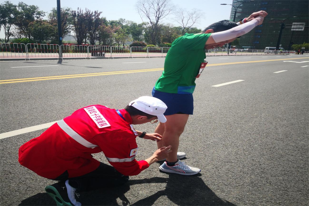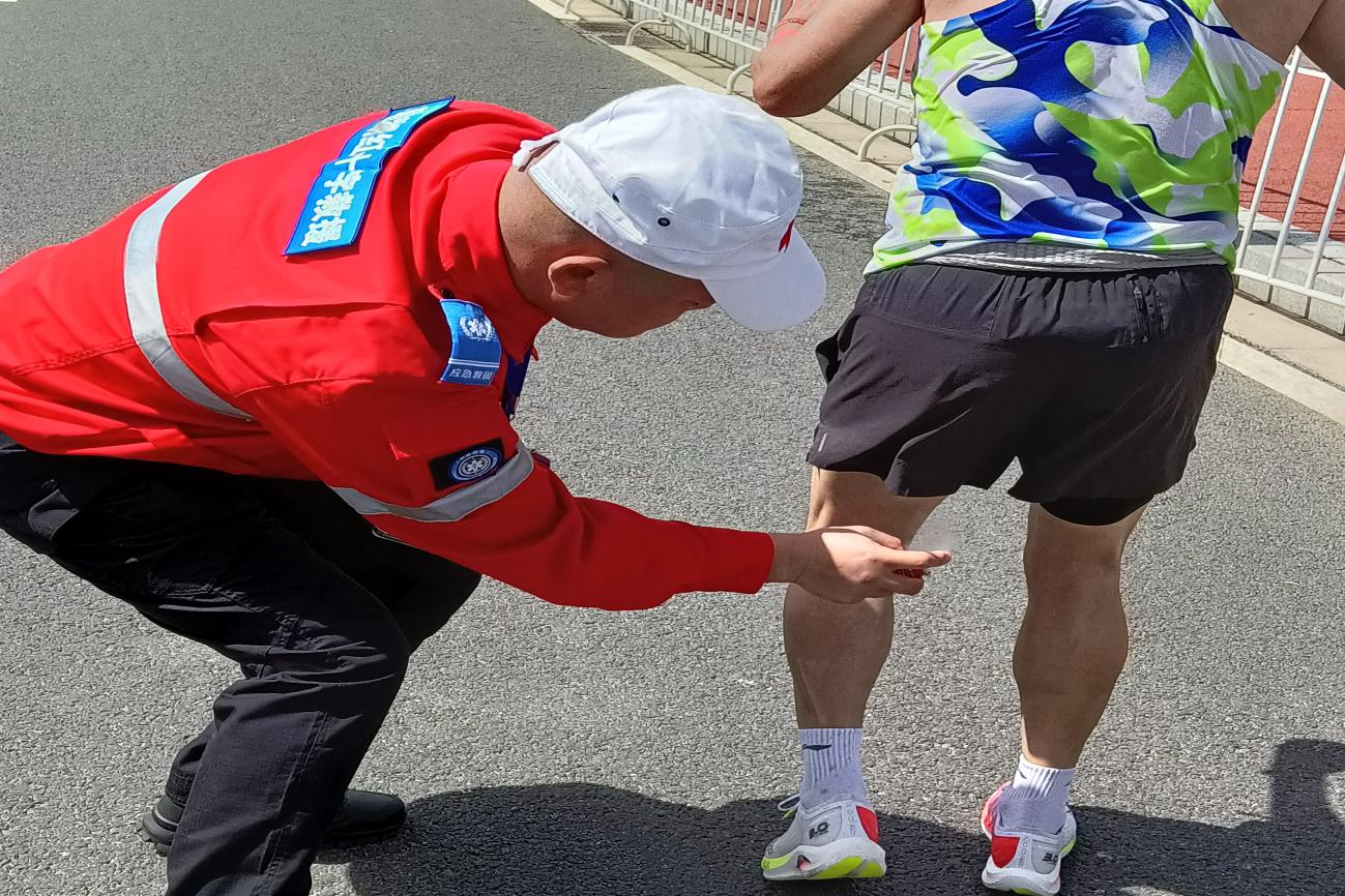 由于马拉松赛事运动员奔跑时间长、身体负荷大,出现严重肌肉痉挛的情况比较常见,因此蹲下身给运动员们喷云南白药、做腿部拉伸按摩是救援队员们最高频的动作了。
