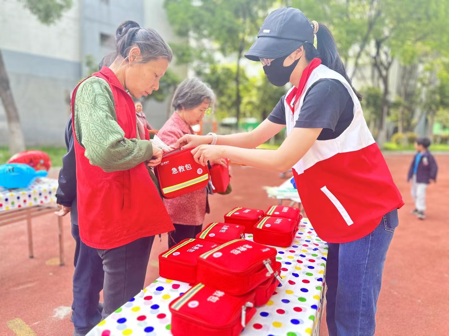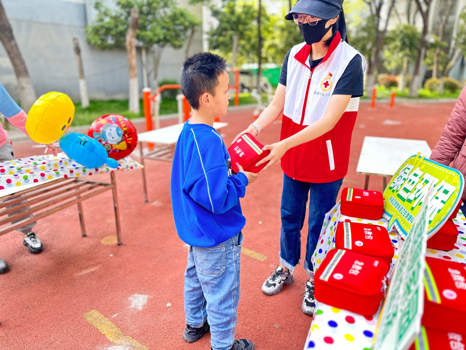 4月16日,硕放街道红十字会在锦硕苑社区儿童广场跳蚤市场开展急救知识普及活动。