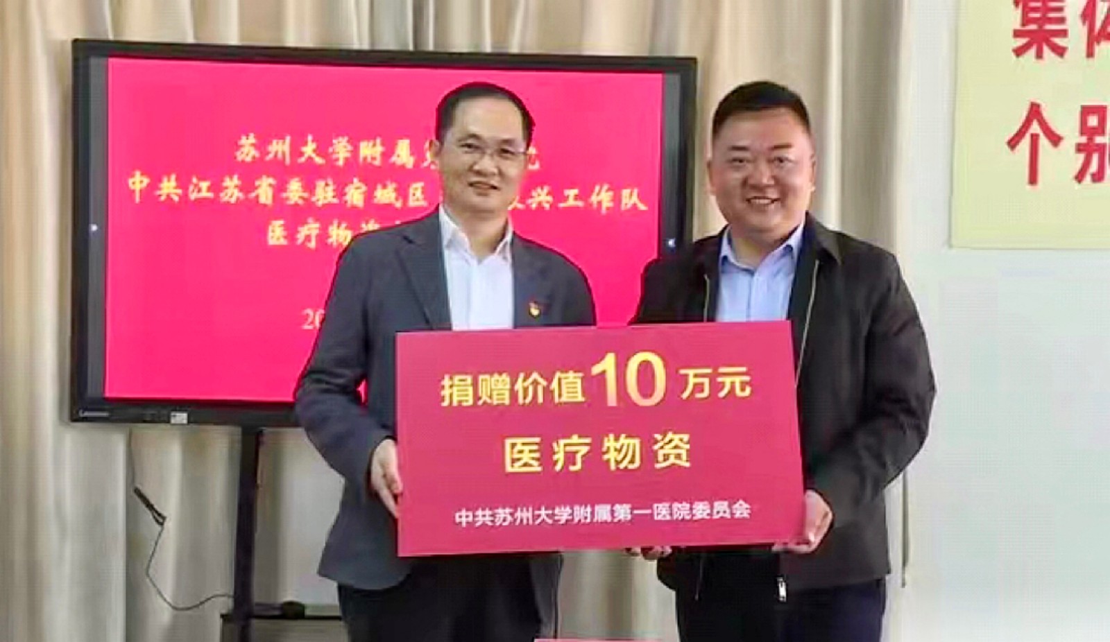 万水千山显真情,苏宿帮扶心连心。4月19日,中共江苏省委驻宿城区乡村振兴工作队联合苏州大学附属第一医院、阿斯利康投资有限公司爱心捐赠活动在宿城区卫健局举行。此次捐献活动是苏州大学附属一院携手爱心企业阿斯利康通过宿城区红十字会定向捐赠一批价值10万元的医疗物资给省委驻宿城区乡村振兴工作队,用于帮扶宿城区卫生健康系统基层医疗机构。