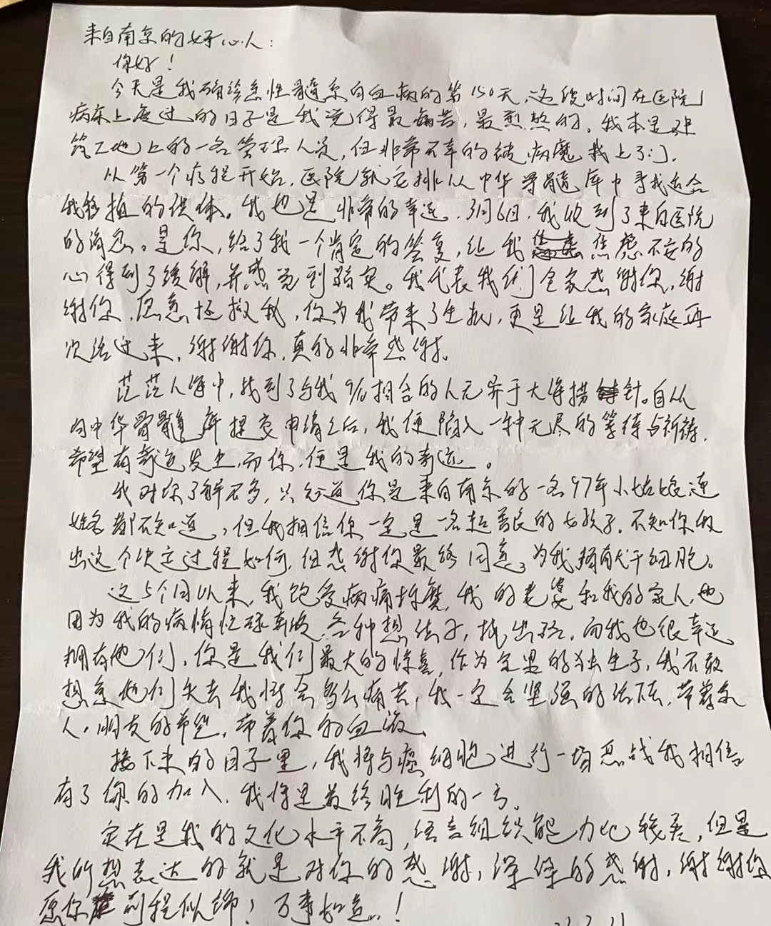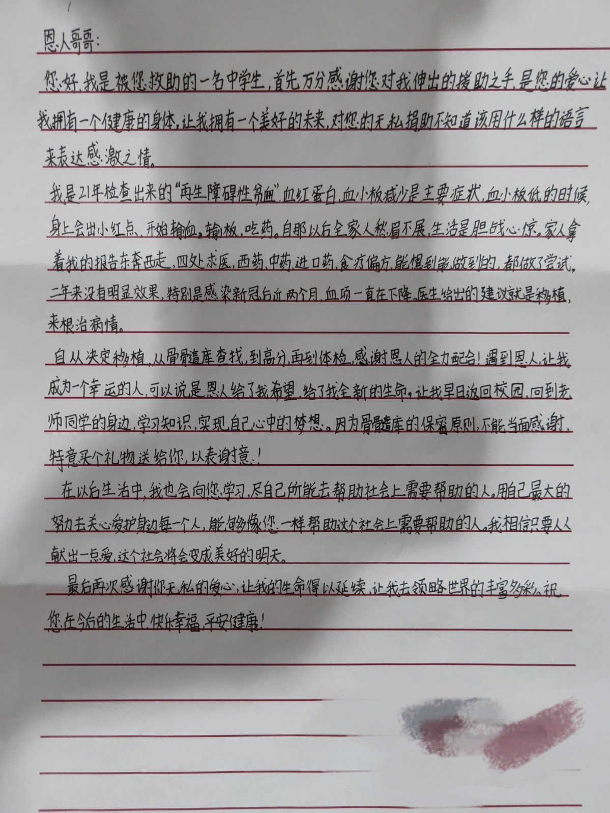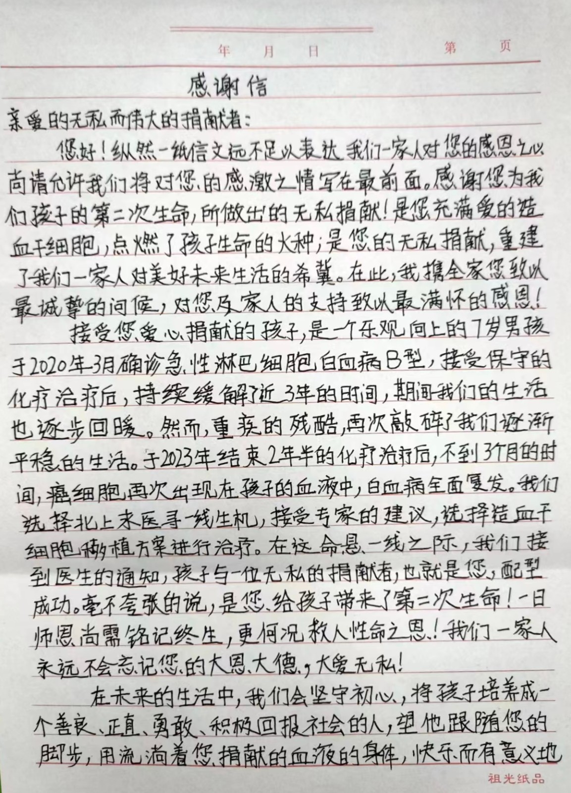 捐献期间,3位“爱心使者”纷纷收到了患者家属们的亲笔感谢信,字里行间饱含了患者家庭面对疾病的种种不易,又让人近距离感受到了人间大爱的温暖。其中的一封信这样写到:“感谢您为我们孩子的第二次生命所作出的无私捐献!是您充满爱的造血干细胞,点燃了孩子的生命火种;是您无私捐献,重建了我们一家人对美好生活的希冀……,我们一家人永远不会忘记您的大恩大德!”3位捐献者胸怀大爱、无私奉献、救人于危难时刻,彰显了新时代青年的为民情怀和责任担当,以实际行动践行了“人道、博爱、奉献”的红十字精神。
