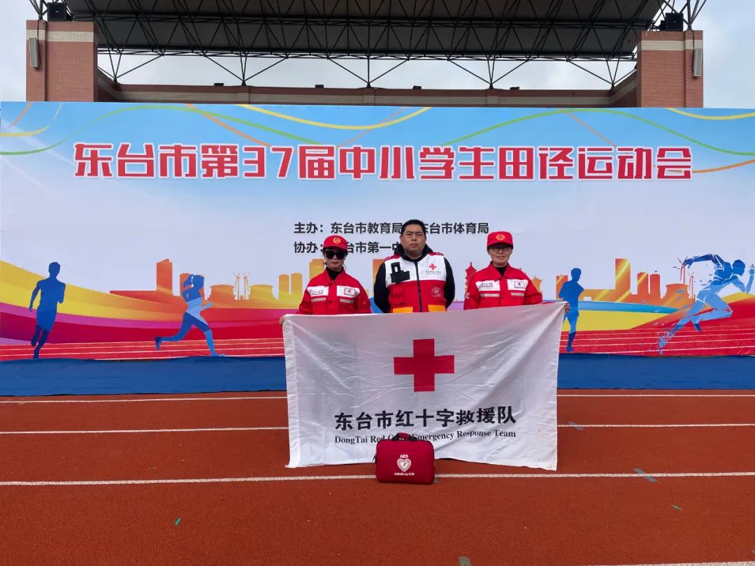 4月15日、16日,东台市第37届中小学生田径运动会在市第一中学田径场举行,全市所有中小学共计824名运动员同场竞技。市红十字应急救援队出动9名队员全程参加保障。救援队准备了急救箱、AED、担架等保障物资,全程待命,随时为运动员提供保障服务,助力赛事圆满完成。