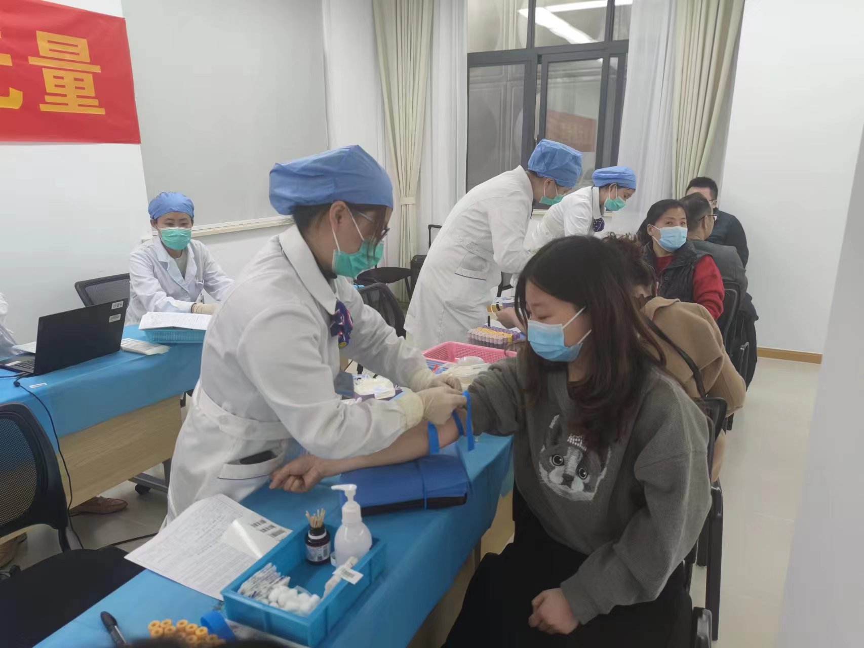医务人员耐心为每一位献血志愿者做好资料登记、温度测量、体检化验等各项准备工作。大家依照工作人员指示,填表、体检、化验、抽血……献血现场井然有序。