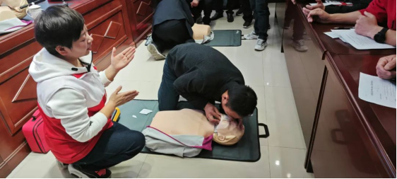 培训现场,红十字师资吴老师通过理论讲解、示范操作、学员互动的方式,着重讲解心肺复苏、AED使用、及海姆立克急救等现场急救的方法,并进行了实操演示。