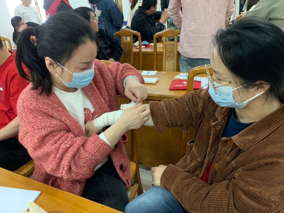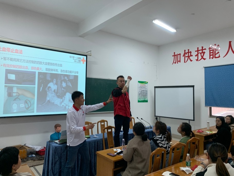 应急救护师资围绕红十字运动起源、救护新概念、气道梗阻急救法、心肺复苏术理论,创伤救护(止血、包扎、骨折固定)进行教学,采取理论知识讲授、现场演示和救护技能实际操作相结合的形式开展。培训内容贴合实际,教师讲解专业生动,学员积极参与课堂互动和实操练习,现场学习气氛活跃。
