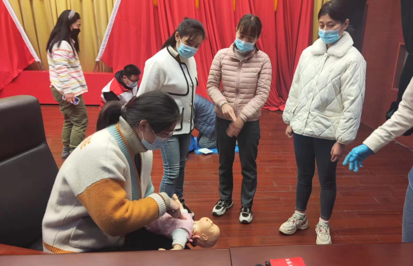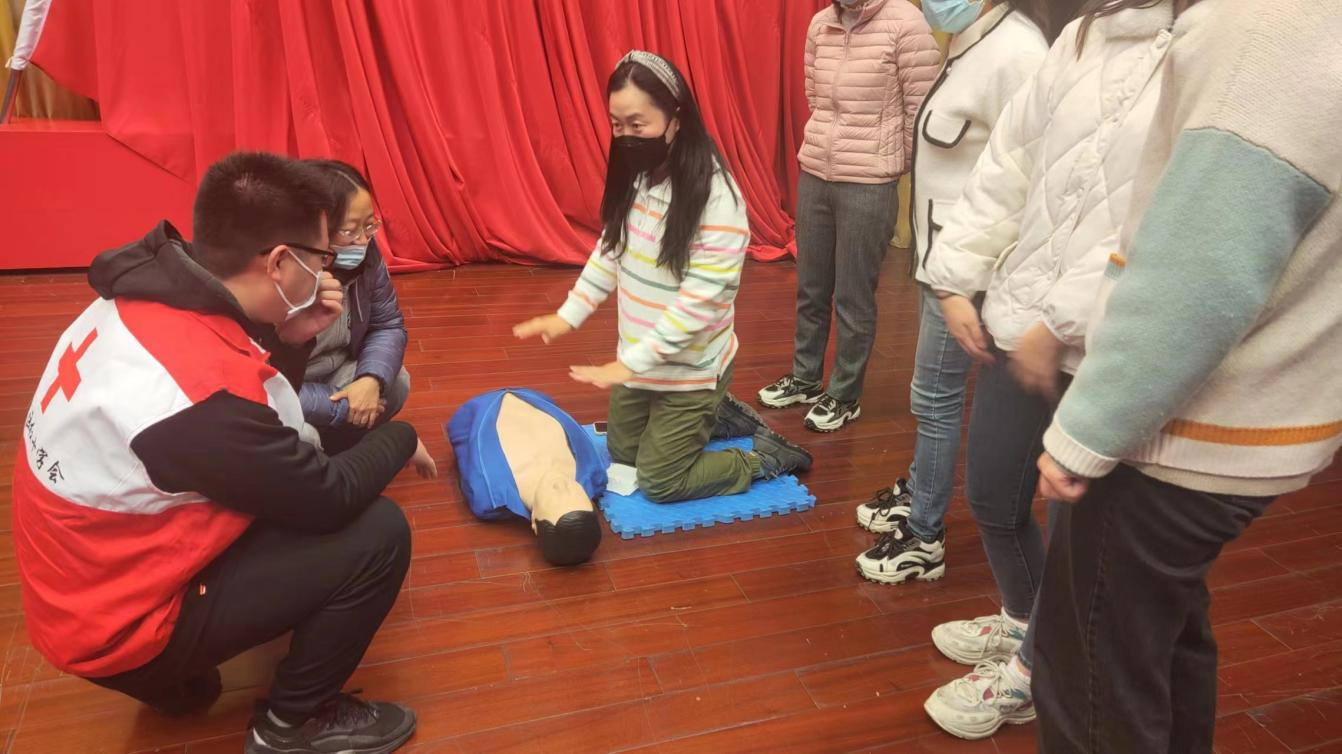 培训现场,区红十字应急救护培训师资首先为大家讲解了应急救护培训的目的和意义,通过真实案例加深了大家对应急救护必要性的认知。随后通过演示和解说相配合的方式,现场教学、模拟示范,为大家讲解了成人及婴幼儿心肺复苏操作流程、AED机的使用方法等急救技能。