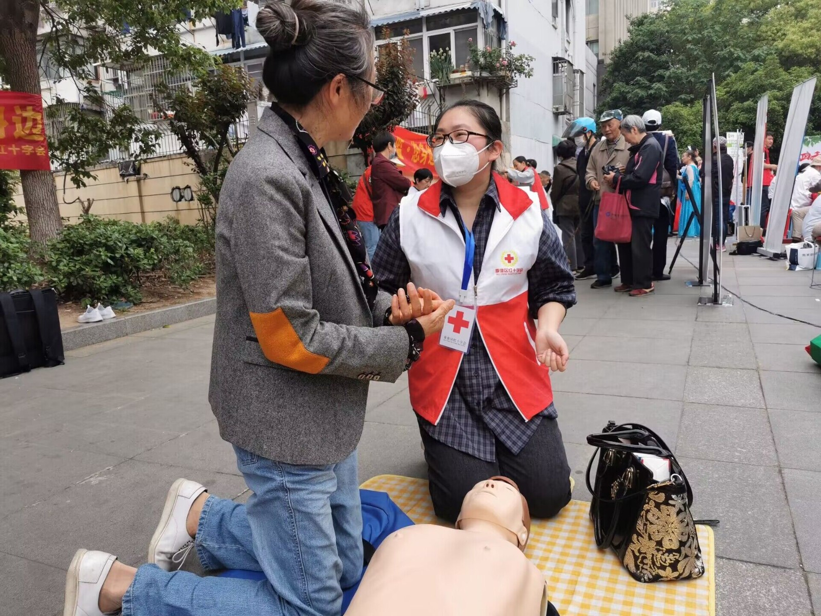 活动现场,红十字志愿者通过播放视频、实际教学、说案例的方式,传授了拨打120急救、心肺复苏CPR技能、气道异物梗阻、自动体外除颤仪AED的使用等常见应急救护知识,并鼓励居民们纷纷进行实操练习。发现问题时,志愿者手把手教学,直至大家正确掌握救护技能。