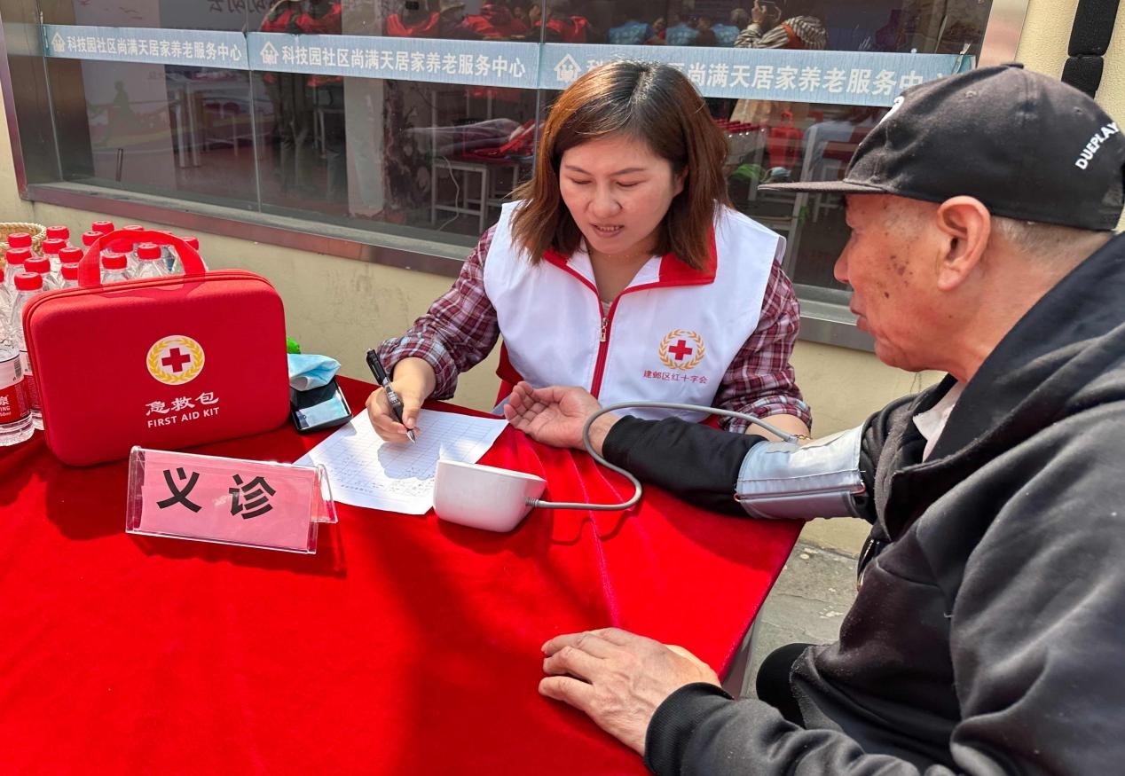 活动现场,社区红十字博爱家园志愿者为现场的居民发放红十字会宣传资料,普及三救三献知识。红十字志愿者现场教学急救知识技能,手把手带领居民学习心肺复苏等急救措施,热心解答居民疑惑。博爱家园义诊服务台边排满了等待测量血压和血糖的居民,围绕检测结果志愿者们给予了有针对性的健康指导,并贴心提供了家庭常备用药。