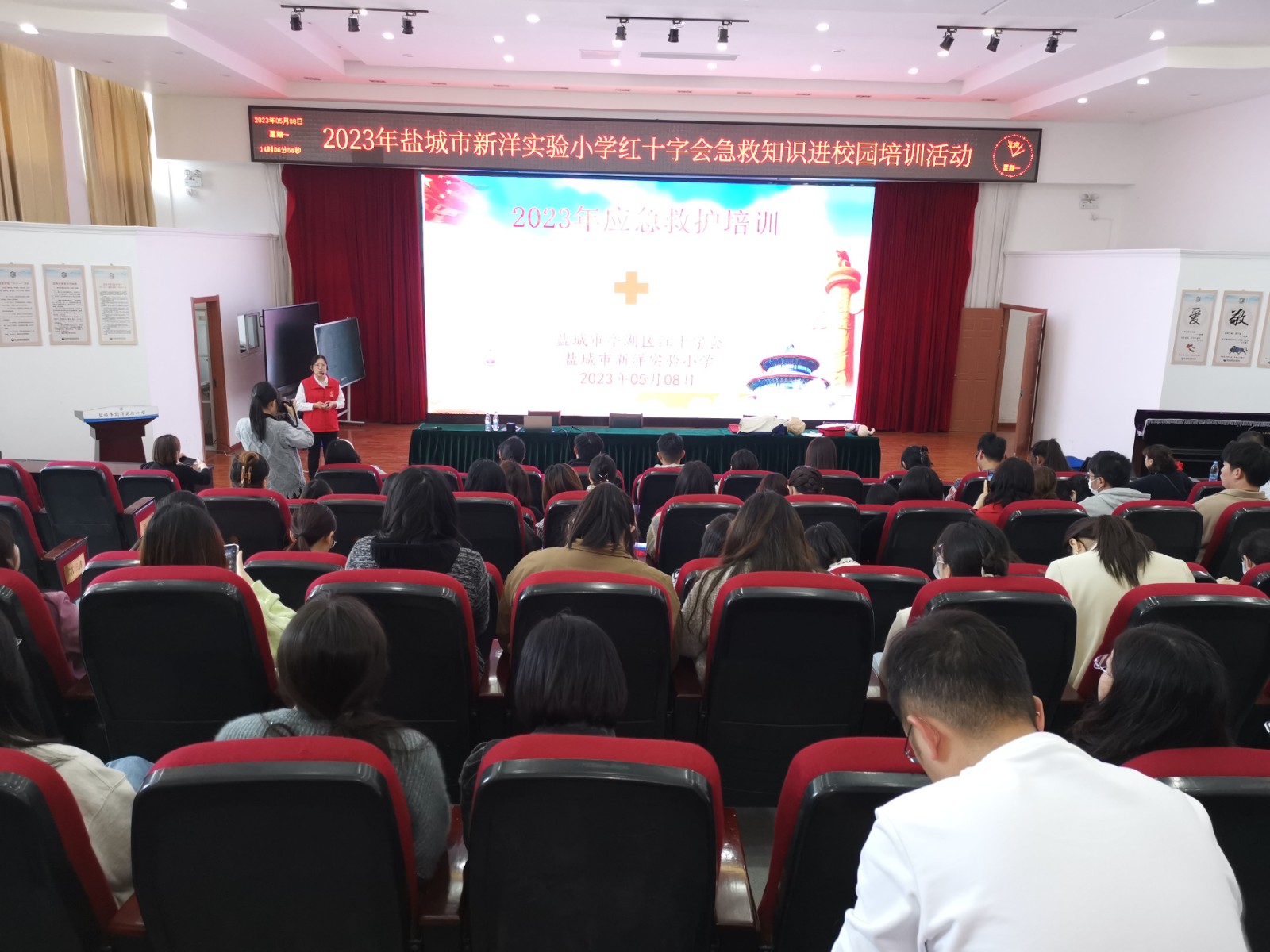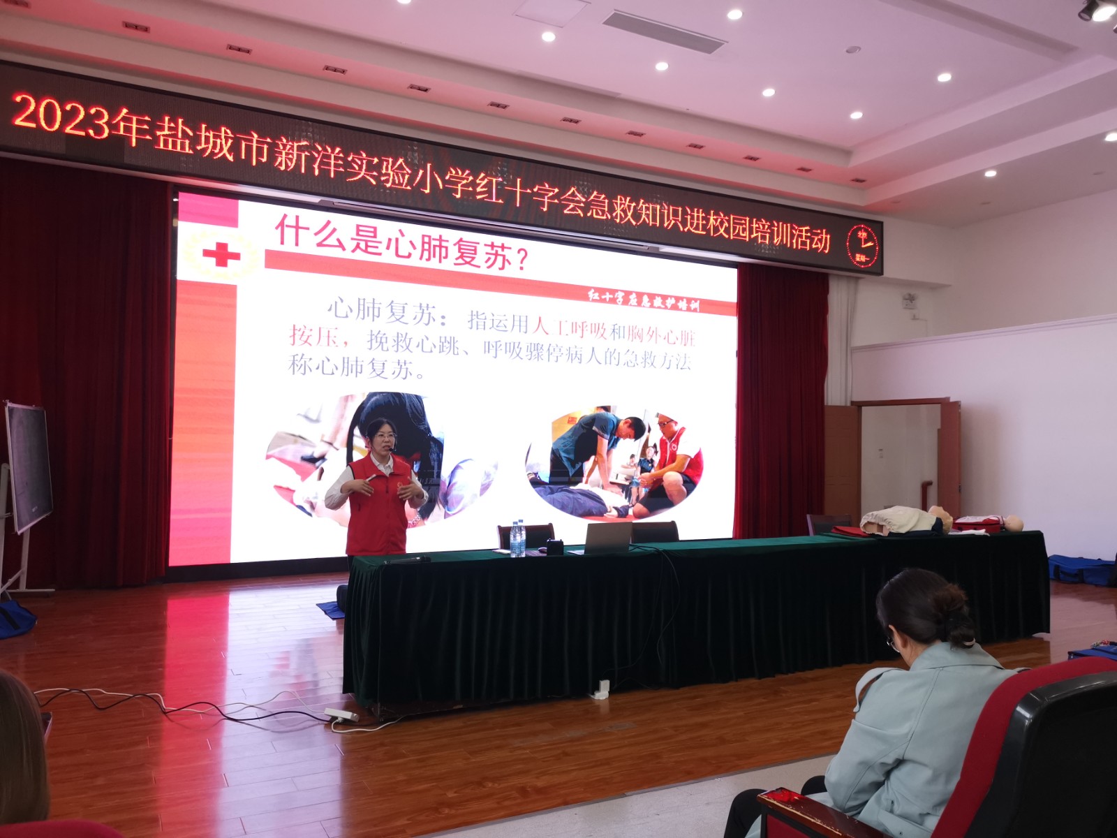 5月8日,亭湖区红十字会“应急救护培训进校园”活动来到盐城市新洋实验小学,为教职员工开展应急救护技能培训,重点讲解、示范心肺复苏术、海姆立克急救法、AED的使用等。