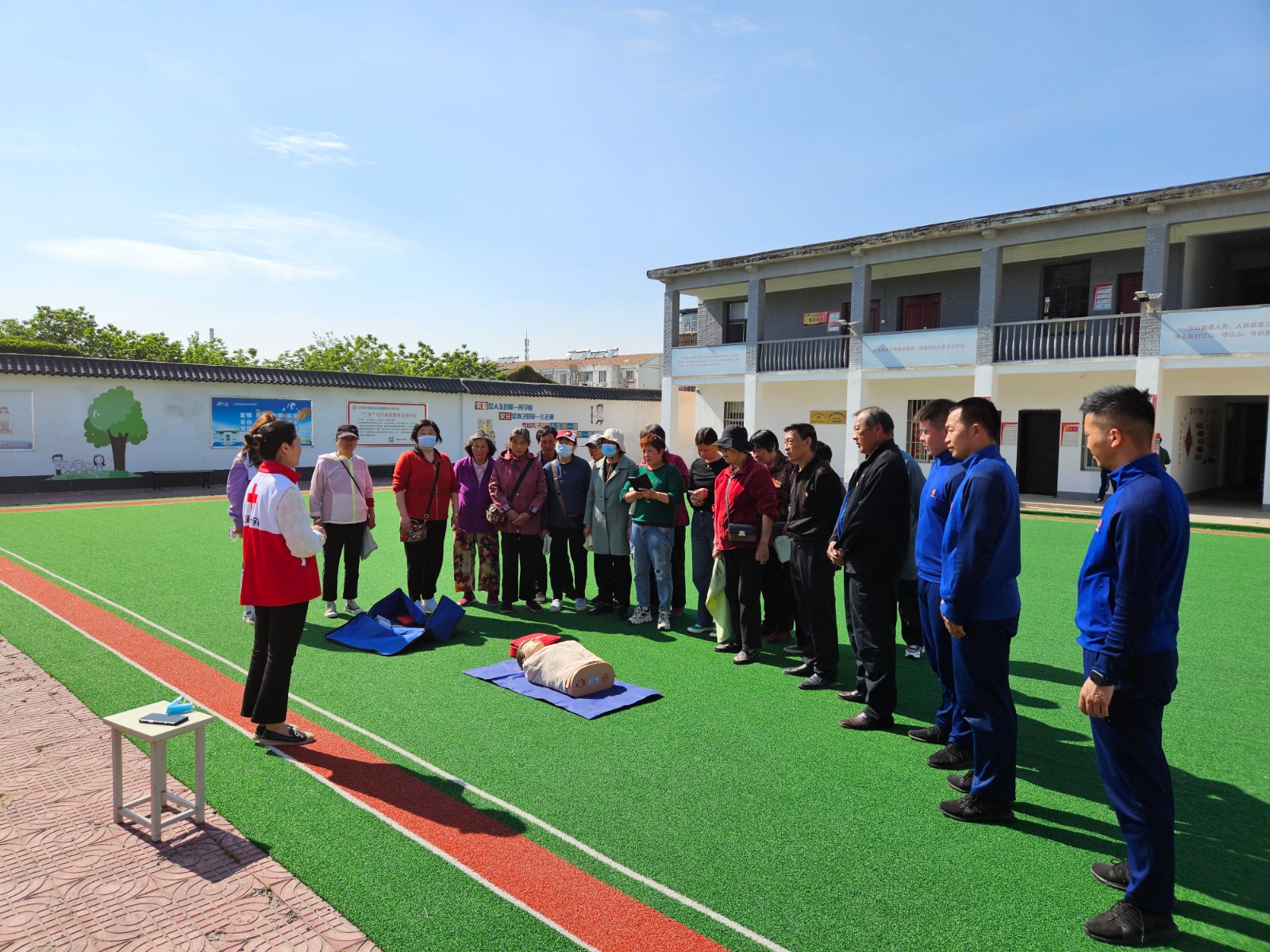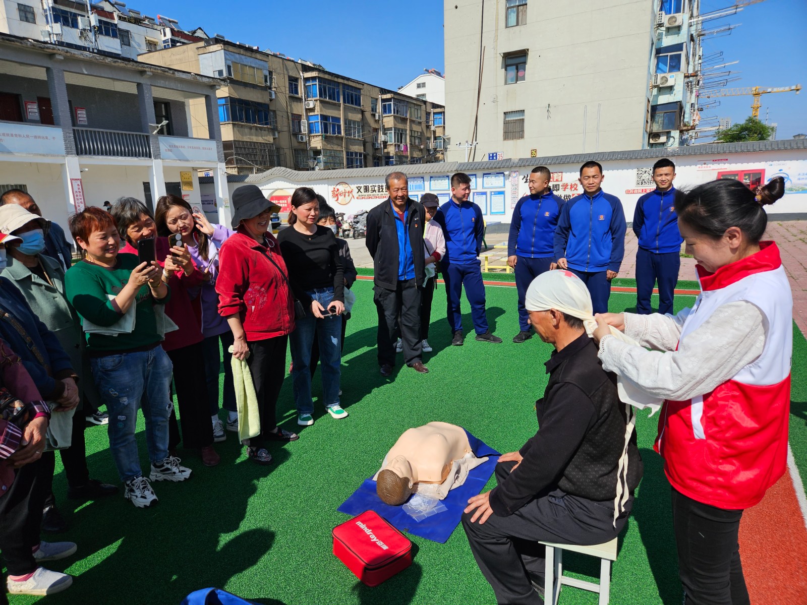 最后,红十字应急救护讲师就演练过程中可能会出现的意外伤害进行讲解,模拟了火灾逃生途中居民腿部骨折受伤需要进行包扎救治。演练结束后,在操场上,还为现场居民演示和讲解心肺复苏操作过程,居民们更是热情争相体验操作训练过程。