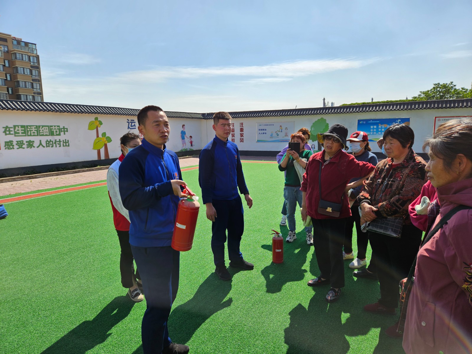 随着演练烟雾弹燃起,清江浦区红十会“5·8博爱周”防灾减灾进社区宣传活动正式开始,社区工作人员参照演习预定方案,迅速组织居民紧急疏散,利用逃生通道及时逃离火灾现场,整个过程有条不紊。消防逃生演练结束后,为进一步巩固实践效果,消防支队教官还现场演示了灭火器使用的操作程序,并让大家亲身体会使用灭火器灭火的感受,使参训人员都能正确掌握灭火器的操作方法。