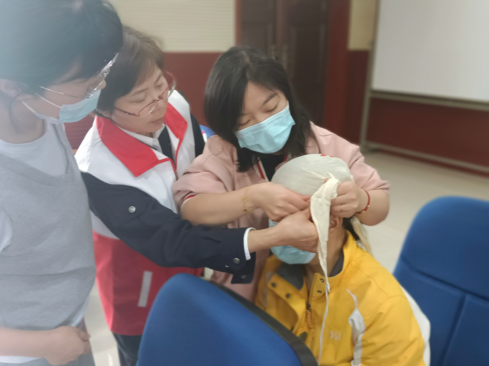 下午的培训内容为创伤急救,讲师就日常生活中常见的各种意外伤害事件的预防及应对措施,作详细的讲解,并用绷带等工具材料现场示范教学。学员们两人一组进行实操练习,掌握包扎技能。