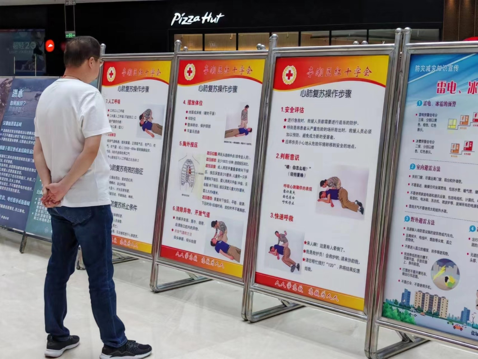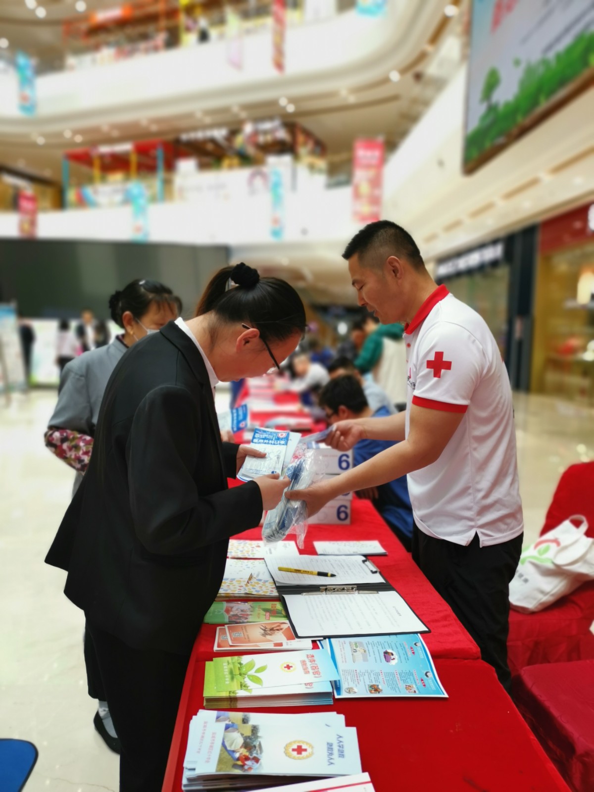 在悦达889商业综合体活动现场,亭湖区红十字会通过设置“三救”(应急救护、应急救援、人道救助)“三献”(无偿献血、造血干细胞捐献、遗体和人体器官捐献)知识展板、分发应急救护手册、开展应急知识答题送小礼物等活动,向市民广泛宣传应急救护知识、普及应急救护技能。