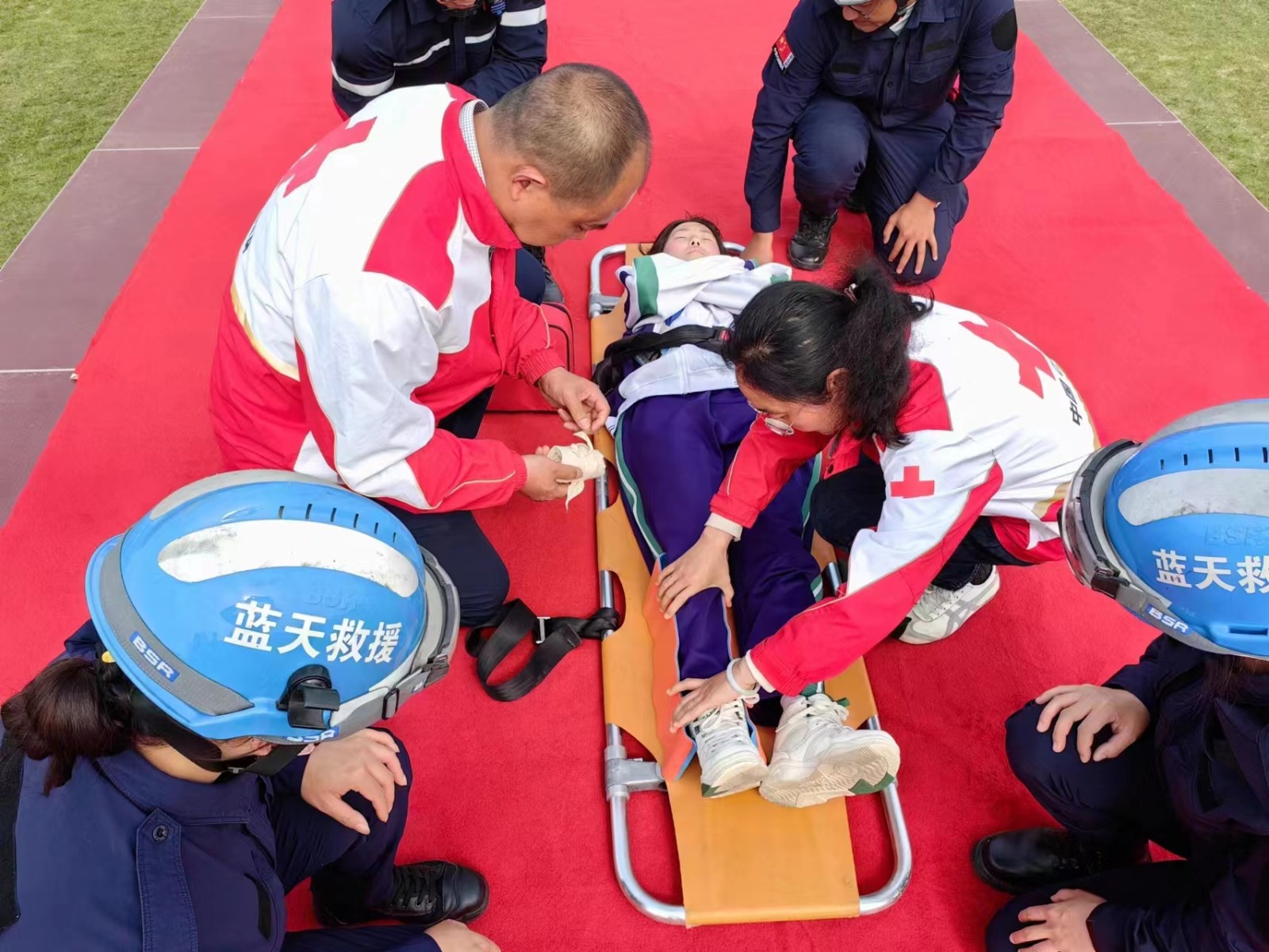 在救援队到来之前,师生们开始互助自救。帮助他们包扎伤口,同学们搀扶着受伤的同伴到达集聚点。开发区红十字赈济救援队队员立即采取救治措施,放平受伤人员,包扎、心肺复苏、除颤仪急救,并将受伤人员抬上担架,送上急救车。区消防救援站消防员们为参会人员介绍了多种消防器材,展示了消防车、消防云梯、消防水炮等消防设备的使用方法。