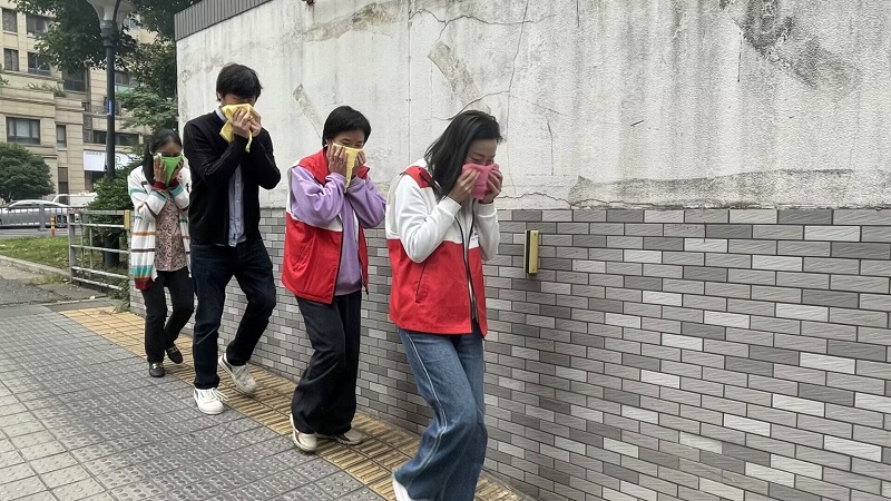 5月11日上午9点半,演练开始了,大家看到有烟雾冒出,听到警报声后,立即用毛巾捂住口鼻,低着头弯着腰,顺着安全通道有秩序地通往安全避难场所,直到灾情结束。