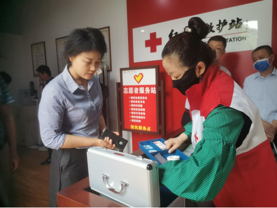 康宁会长一行首先来到户部山景区红十字救护站。户部山景区红十字救护站紧邻游客中心,是应急救护的主阵地,其中配备了AED自动体外除颤机、轮椅、担架、应急救护箱等救护设施,展示了救护站工作制度、工作流程、应急处置步骤等,红十字志愿者坐班值岗,并专门设立了母婴室。在工作人员的讲解下,康宁会长一行对景区红十字救护站的应急设施、物资储备及红十字志愿服务队伍建设和活动开展情况进行了肯定,表示户部山景区红十字救护站作为区文旅产业结合红十字文化的一扇窗口,展现出了区红十字工作的创新和用心,服务市民游客及全区经济大局发展,擦亮了红十字品牌。