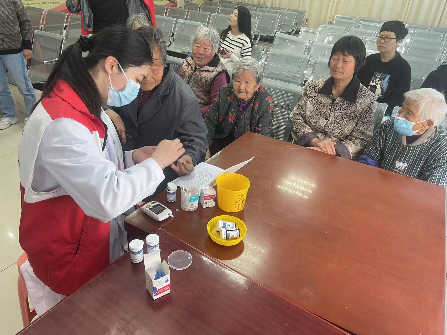 天气转暖,为了提高居民的生活品质,增强健康保健意识,4月28日,海西社区博爱家园邀请医务室黄医生,为居民们提供免费的检测血糖、量血压检查身体义诊活动。