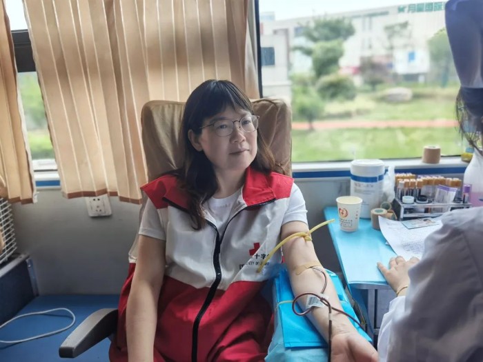 参加献血的干部职工和医务人员有序进行填表、测量体重和血压等各项前期步骤。献血车上暖意融融,大家撸起袖子献出自己的一份热血。随着采集袋晃动,一股股饱含着爱心的鲜血被收集起来。在众多献血身影中,有献过血的老同志,也有初次献血的新面孔。作为医务工作者,大家更加清楚无偿献血对救助生命的重要作用,以此来尽自己一份微薄之力,共建生命绿洲。