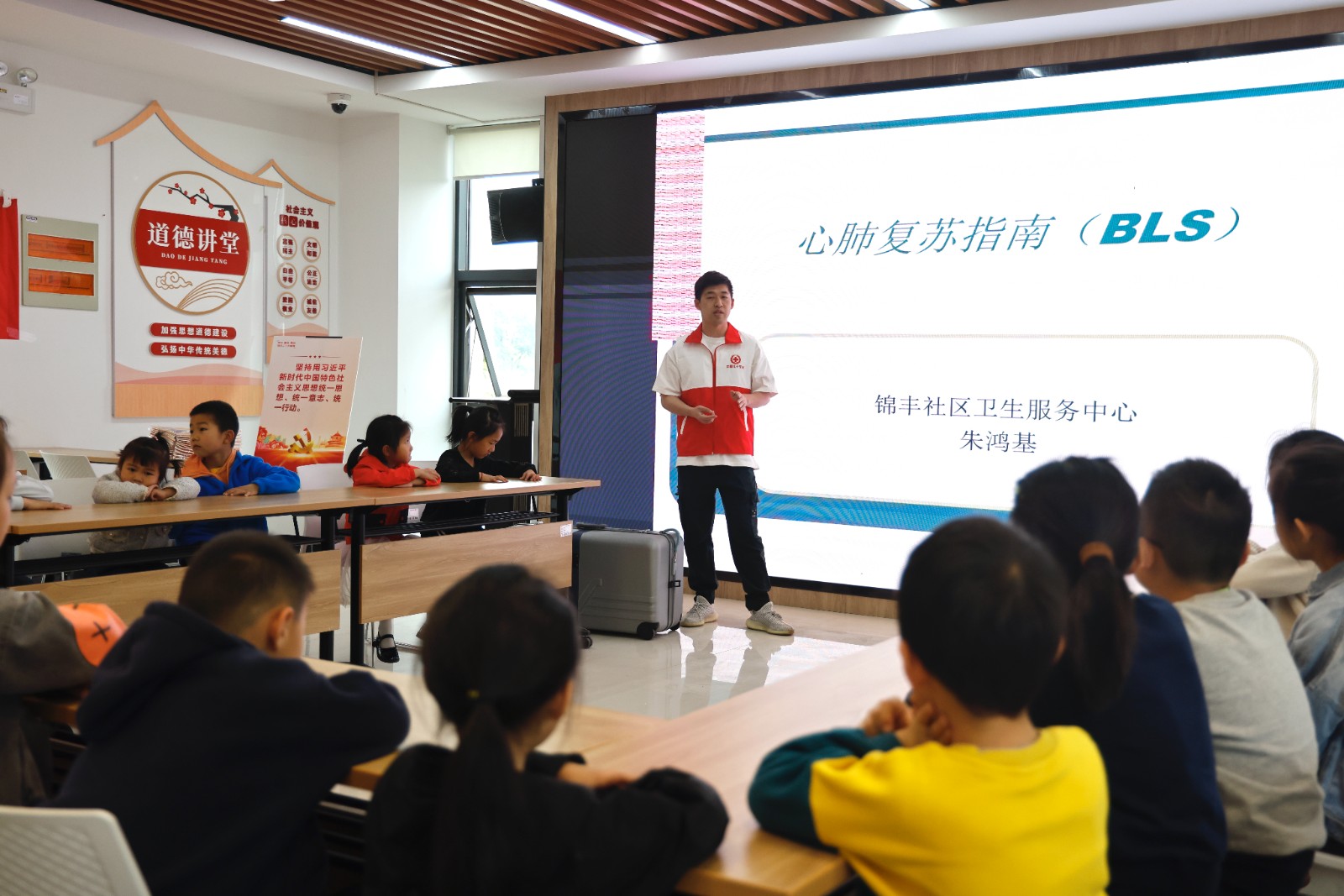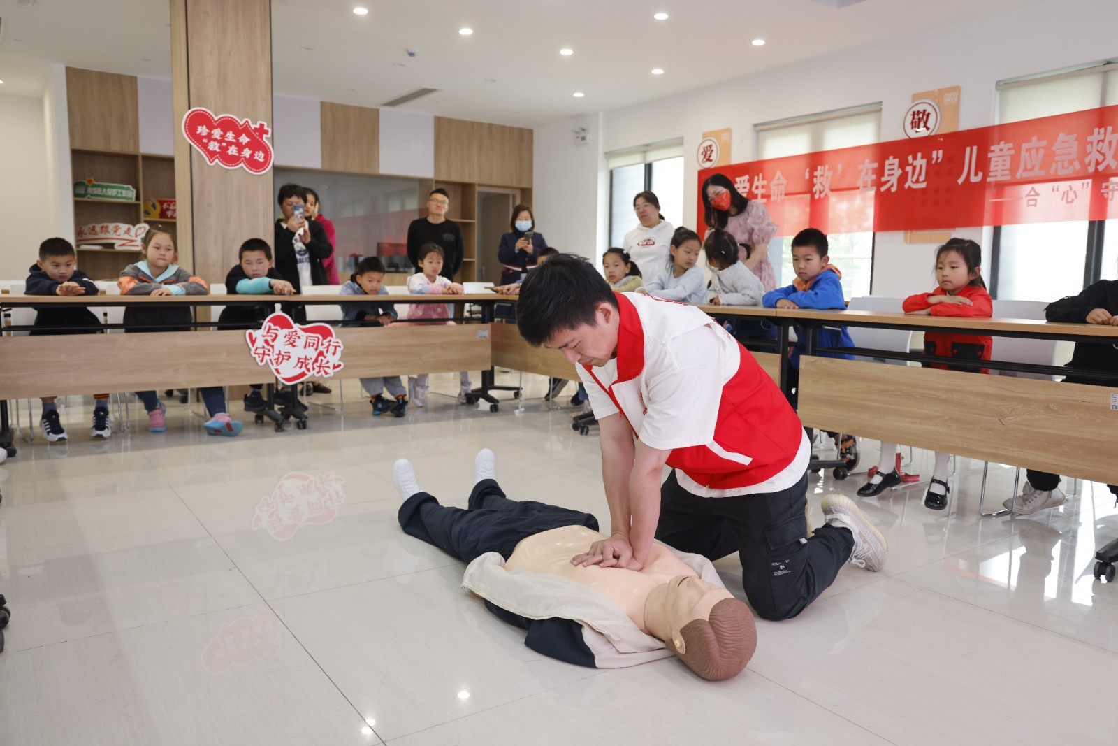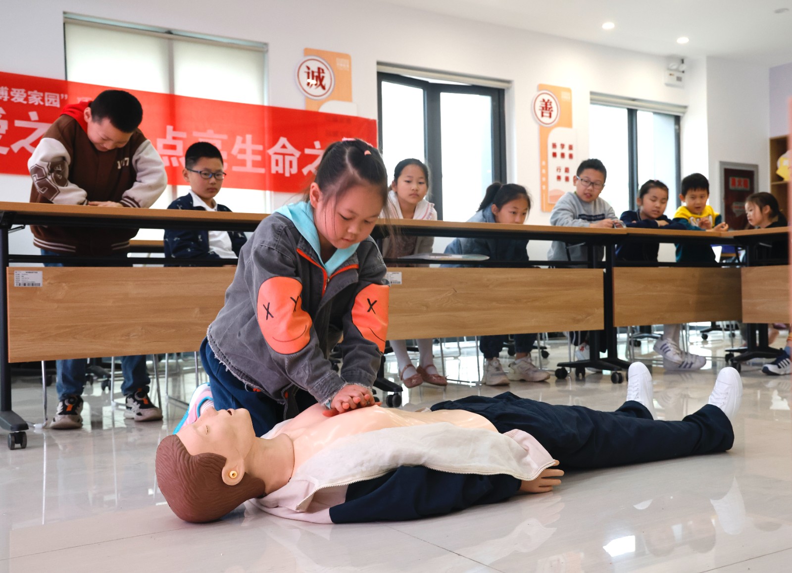 随后,来自锦丰镇卫生服务中心的红十字志愿者朱鸿基医生利用PPT直观讲解情景模拟、列举实例、实际操作等方式为孩子们普及心肺复苏、气道异物梗阻的急救知识和技能。在情境模拟环节,孩子们有条不紊地对急救假人实施现场评估、脉搏检查、胸外按压、开放气道、人工呼吸等心肺复苏步骤以及当有异物卡喉时如何自救等方法。