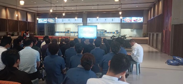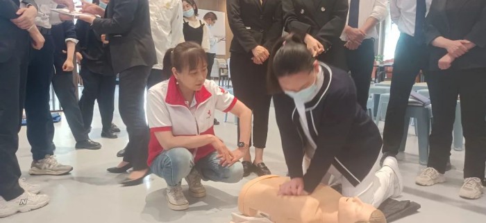 江苏省“五星级应急救护师”徐茂林,南京市应急救护主任导师史梅兰,资深救护老师邱霞以简单易懂的语言为员工讲解心肺复苏、气道异物梗阻和意外伤害的救护知识,同时利用模拟教具、幻灯片向大家详细讲解急救的原理和技能。大家听得十分认真,在操作练习环节争相体验。