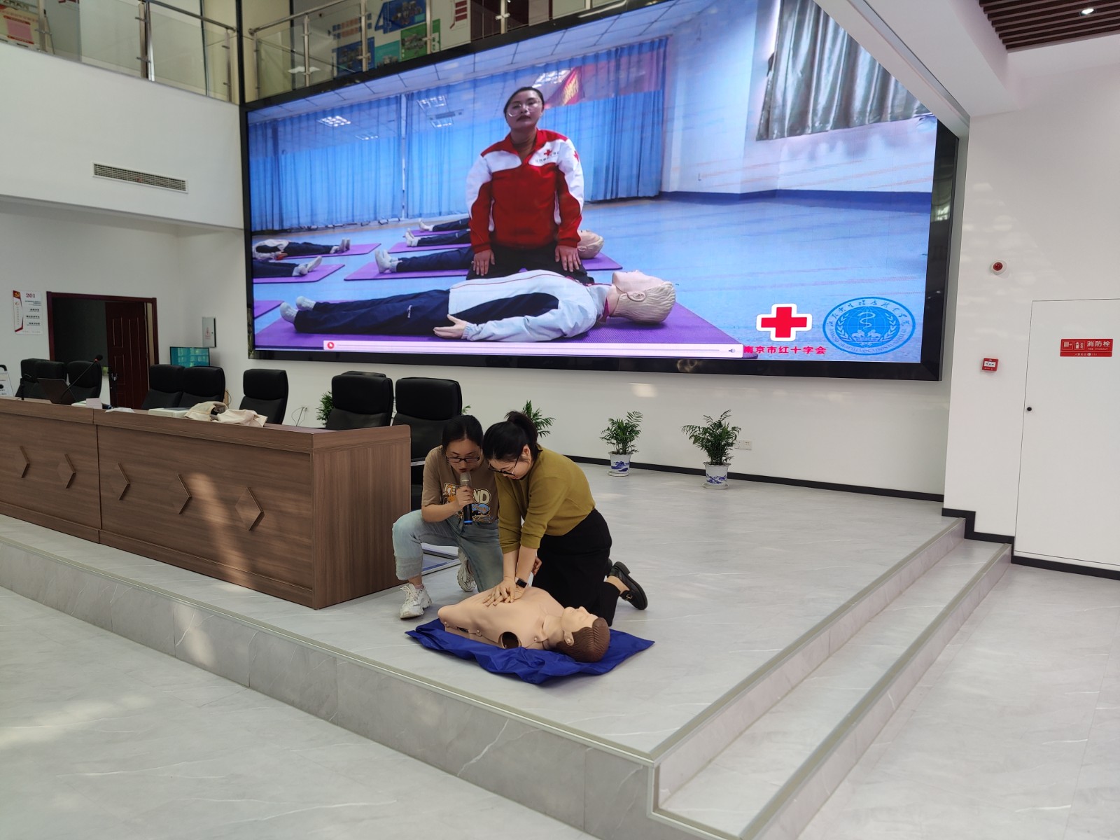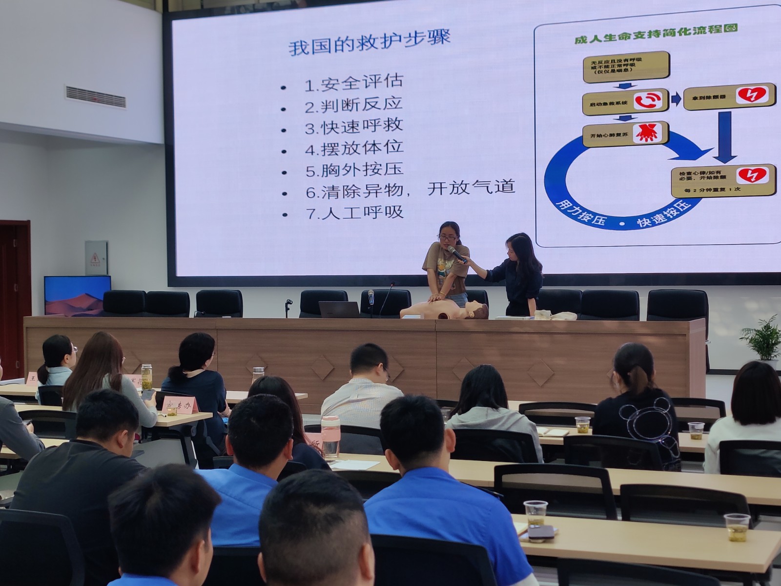 首先,老师讲解了心肺复苏、自动体外除颤仪使用方法、以及海姆立克急救法的理论部分,让现场学员有了初步的了解和认知。随后,老师通过模拟人和AED为大家示范各环节的操作流程和技术要领。最后,在老师的指导下大家积极上台利用仿真人开展人工呼吸、心脏复苏以及练习AED设备的使用方法。