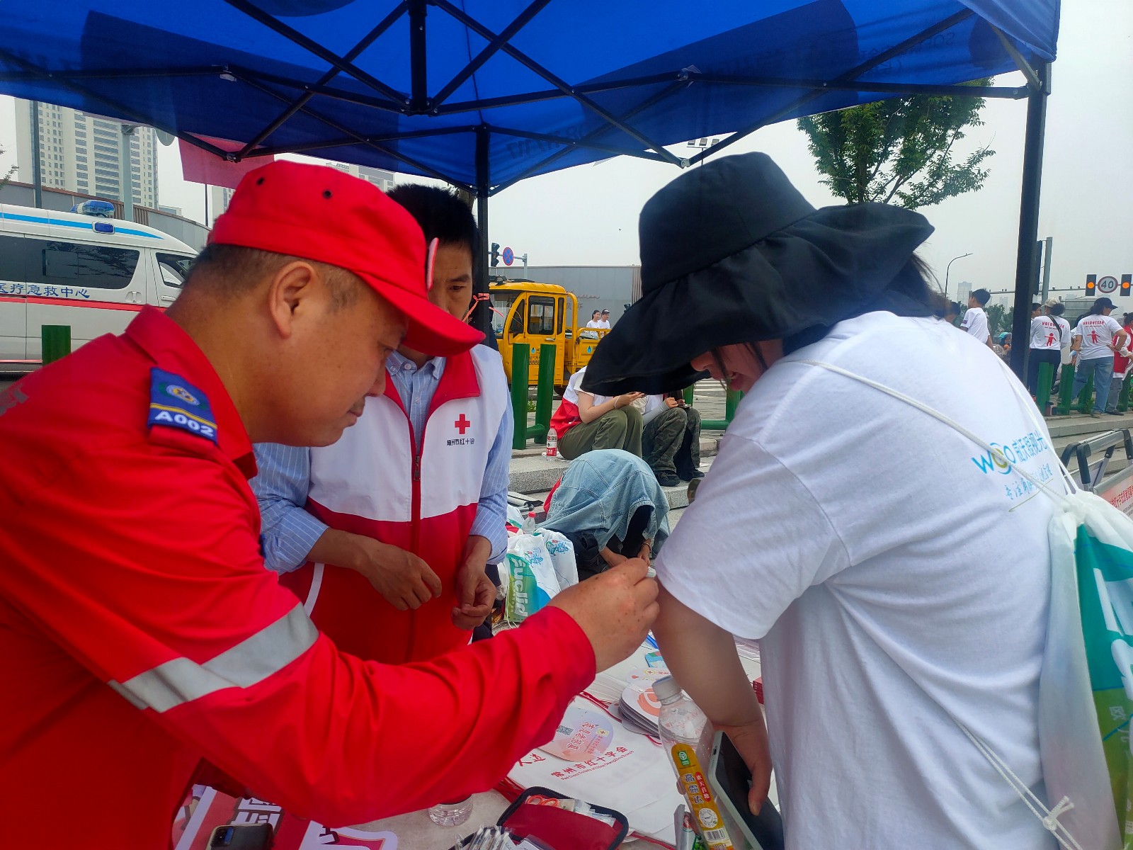 活动当天,当选手陆续到达站点时,志愿者们第一时间为“奶粉”们送上清凉手摇扇、手机风扇等防暑降温物品,并提供咨询、指引等志愿服务,并适时组织开展知识问答、应急救护体验等活动,并送上市民急救手册、防溺水用品等急救小礼包。