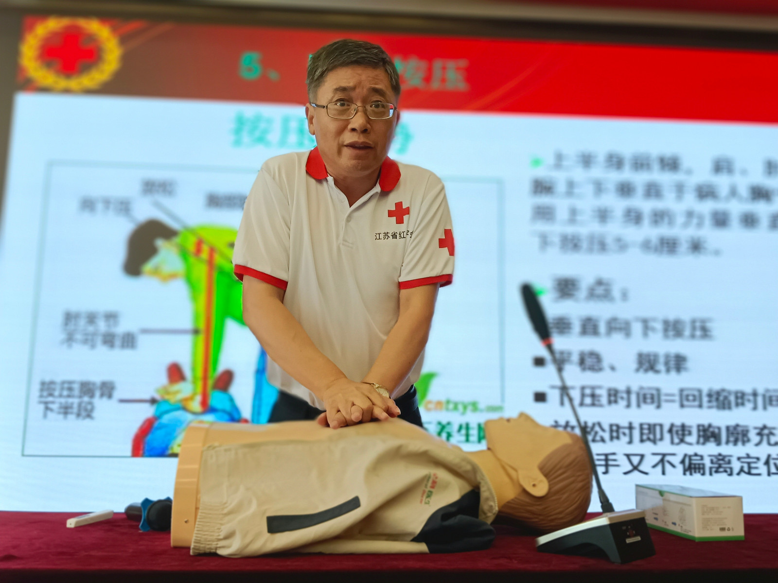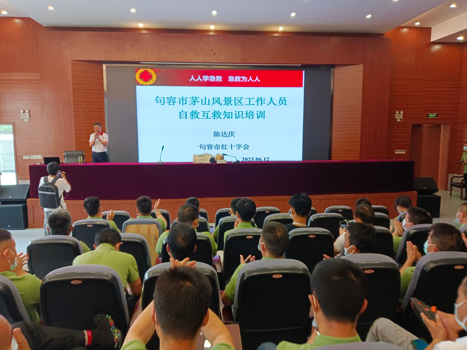 12日,红会讲师陈达庆来到茅山风景区,为景区120余名工作人员开展了一场应急救护普及培训。