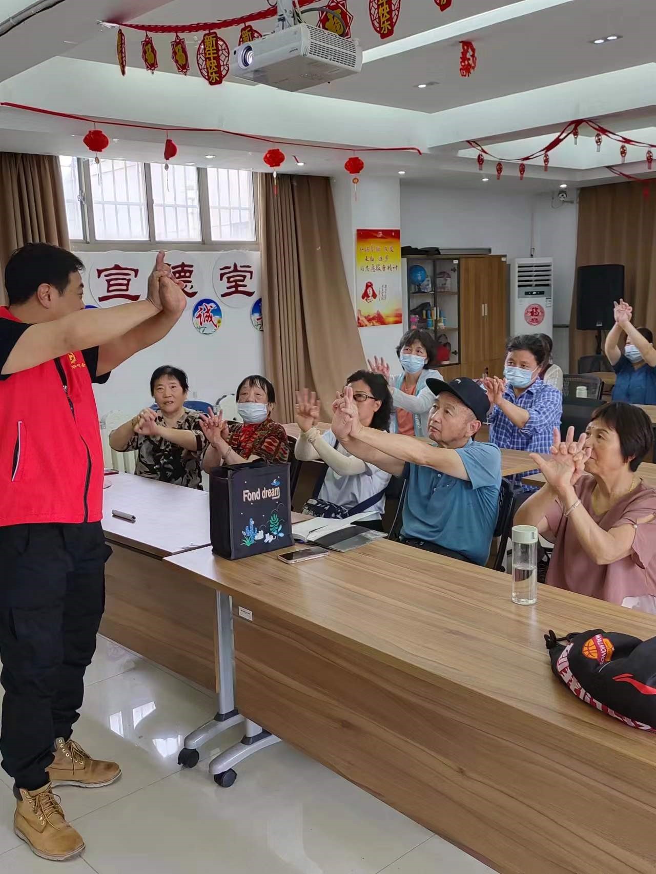 许老师围绕心肺复苏术、AED使用、气道异物梗阻鼻出血处理、扭伤处理、癫痫处理、烫伤处理、虫咬处理等居民日常生活中易发生的状况展开教学,为了使专业的知识更加贴近生活、通俗易懂,还邀请学员们进行互动,现场气氛活跃。在心肺复苏实际演练环节中,许老师现场演示了正确的心肺按压手势,使居民们较为系统地掌握了心肺复苏现场紧急救援知识与正确处理方法,进一步提升了他们的学习兴趣。