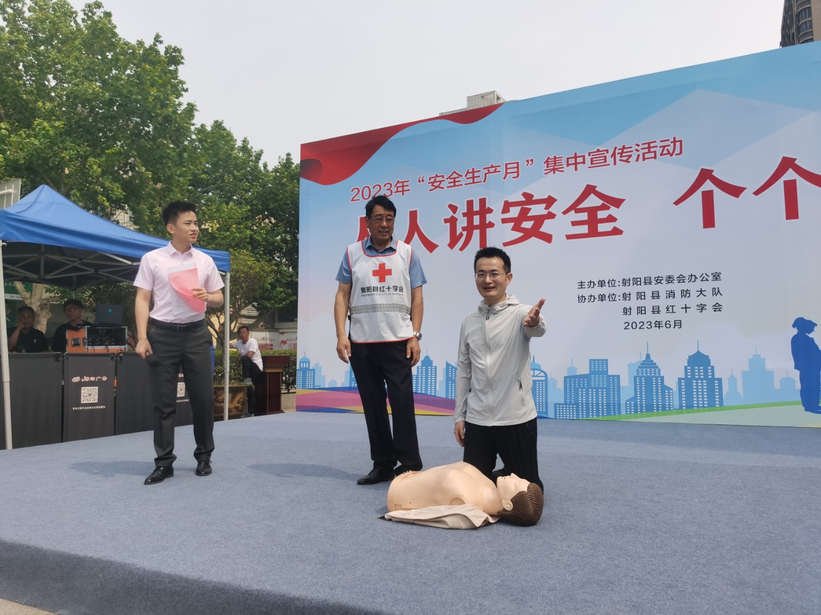 今年6月是全国第22个、全省第30个“安全生产月”。由射阳县安委办主办、县消防大队、县红十字会协办的“人人讲安全 个个会应急”主题安全生产月宣传活动拉开帷幕。来自全县20多个部门,镇(区)参加集中宣传,向近千名群众散发各类安全知识宣传单页和手册。现场,县红十字会专题安排一场心肺复苏和除颤仪培训活动,为汇聚安全发展合力提供了红十字会的支持,用实际行动筑起全县生命安全屏障。