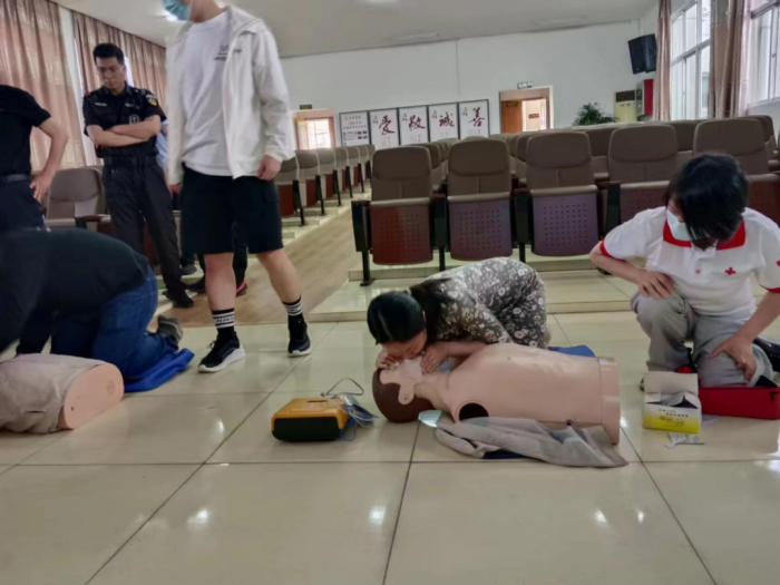 随后,区红十字会工作人员现场演示心肺复苏术、海姆立克急救法等紧急救护技能的操作步骤以及AED的使用方法。