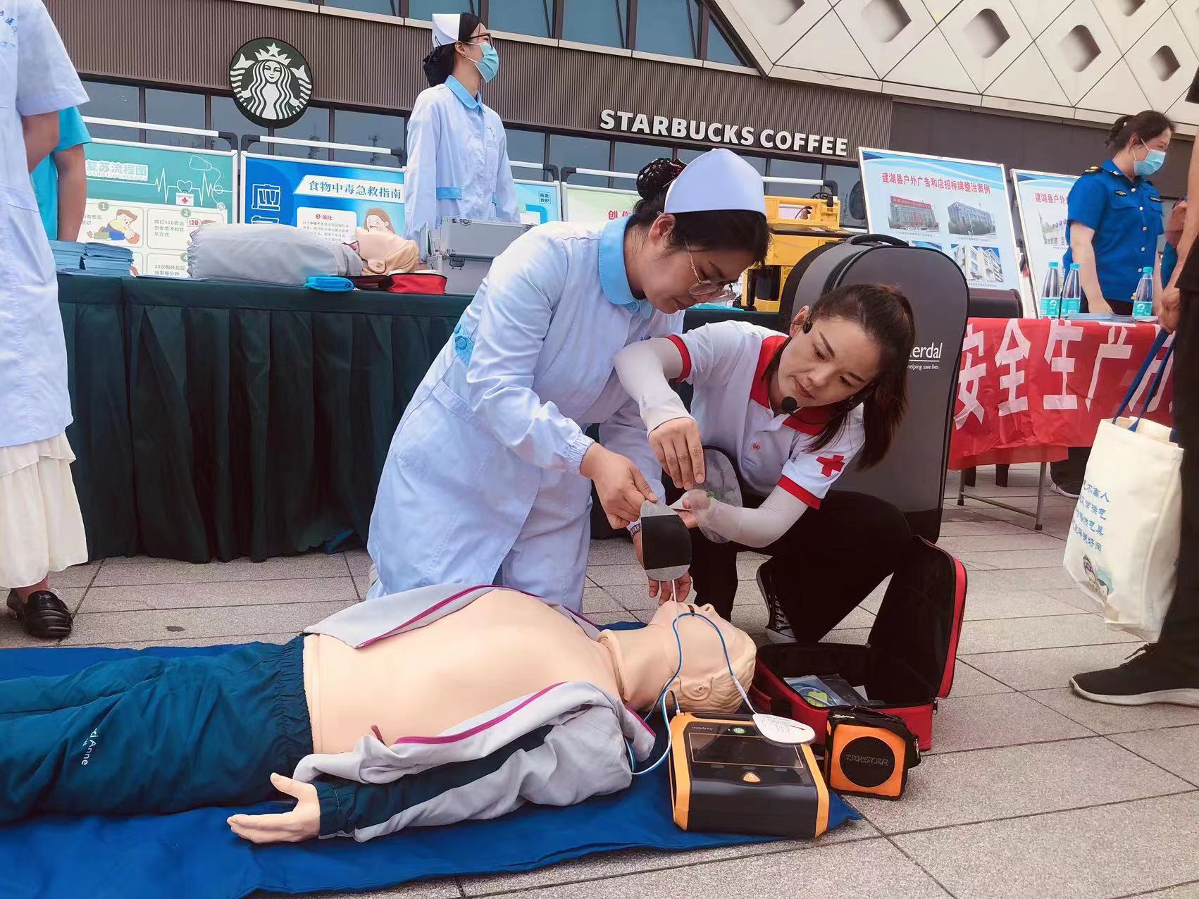 在活动现场,县红十字会应急救护培训老师通过AED(体外自动除颤器)急救设备的操作演示,面对面向市民们讲解了在遇到紧急情况时,如何通过心肺复苏术、海姆立克法等急救技能挽救生命,并邀请在场的群众亲自操作体验,手把手教学,让市民在趣味实操中了解和掌握应急救援的知识与技能。