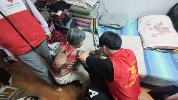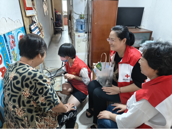 端午粽香养老情,邻里互助志愿行。随后,区红十字会党支部党员、燎原社区红十字博爱家园工作人员及大爱急救公益服务中心大学生志愿者们前往社区高龄老人和困难党员家中,为他们送去粽子与节日的慰问,开展“邻里互助”志愿服务,并为老人们进行血压测量及身体检测。在社区张志英奶奶家中,90多岁高龄的老人精神矍铄,对大家的到来表达了欢迎,大学生志愿者们根据血压测量结果为张奶奶提出了健康建议,老人十分高兴;在社区魏桂侠奶奶家中,区红十字会为其进行的家居提升项目被老人始终挂在嘴上,感谢党和政府对其的关心和惦念;在其他老人家中,大家为他们进行了家庭卫生打扫、健康养老宣传等多种形式的服务,赢得了老人们的一致认可与好评。