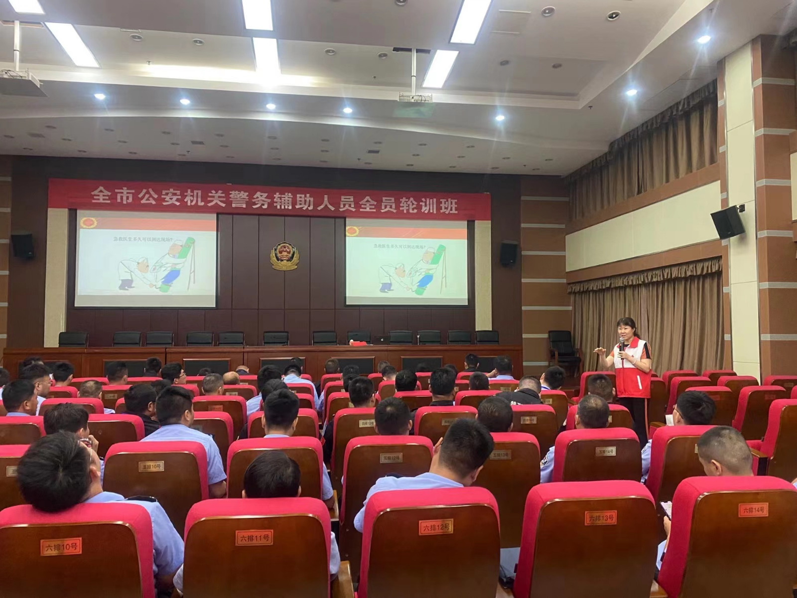 6月25日,句容市红十字会救护培训老师朱水清再次来到全市公安机关警务辅助人员全员轮训班,为参加第7场轮训的60名警务辅助人员接受培训。