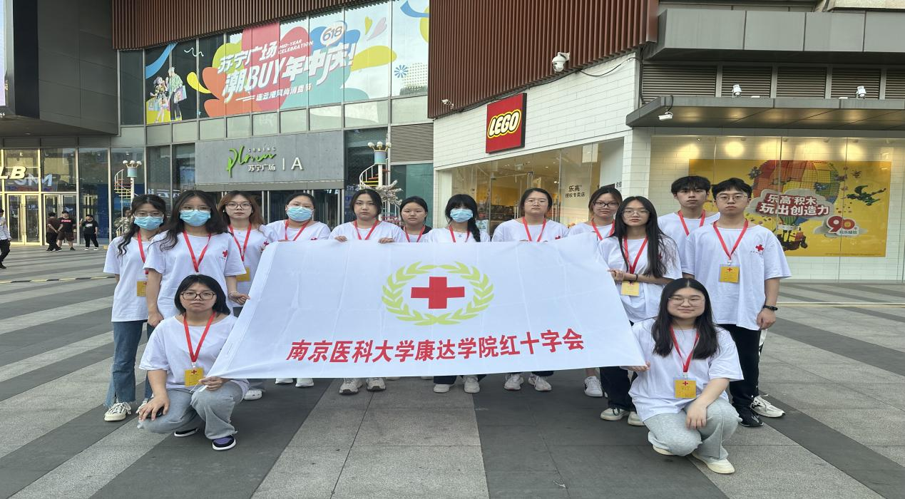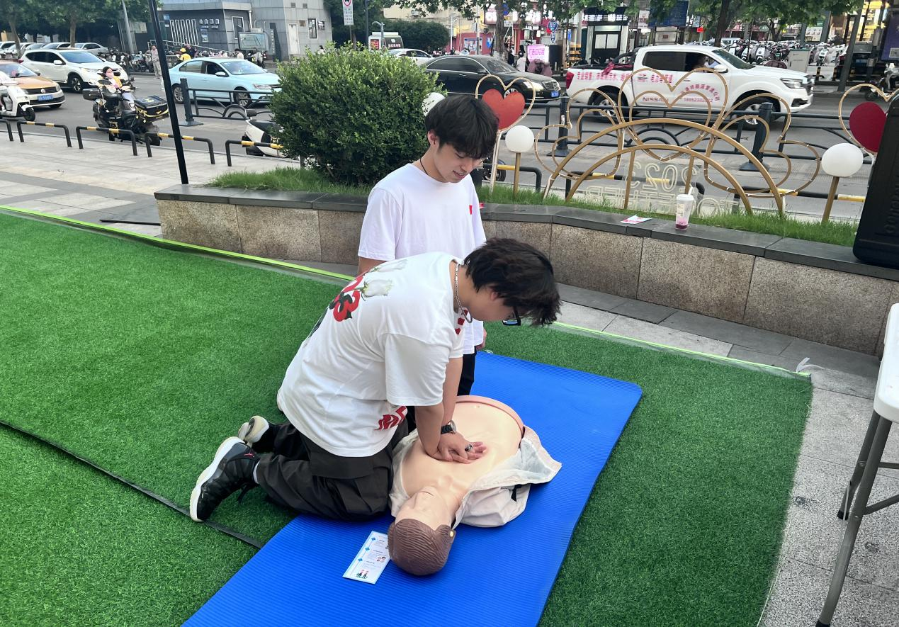 6月15日下午,志愿者队伍乘公交车到达苏宁广场。到达后,同学们迅速摆放好桌椅,投入到工作中。一些同学继续宣传我们制作的手册——关于CPR和海姆克力急救法。志愿者们亲自示范,吸引了广大群众的围观,其中一位群众在志愿者的指导下,亲手体验了CPR。
