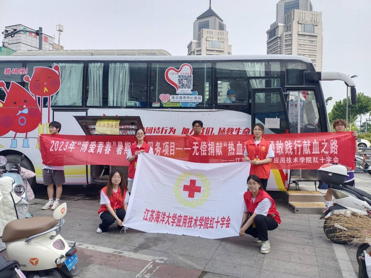 为庆祝学雷锋60周年,弘扬雷锋精神,2023年6月23日江苏海洋大学应用技术学院红十字会勇敢践行献血之路的志愿者在苏宁广场进行血车、献血知识的宣传。