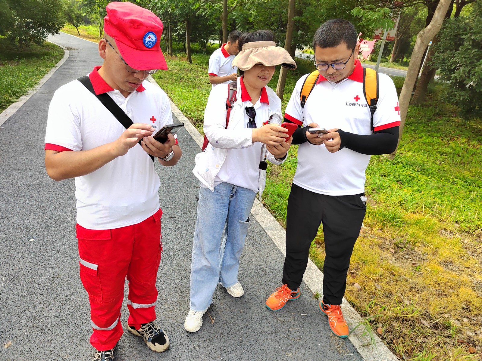 此次活动设置救援科目主要训练救援野外坐标定位能力、搜索目标信息能力。早上八点,队伍集结到达指定地点,分成四个小组,依次从黄天荡广场出发向坐标点徒步前行,途经丹徒世业卫生院、永茂圩、先锋村,路程全长约7.1公里。虽然天气有些炎热,但艳阳高挂不减党员们的热情,大家精神饱满,团结协作,运用户外助手设备寻找不同的坐标点,选择合适的通行路线,经过2个多小时的时间顺利完成了任务。