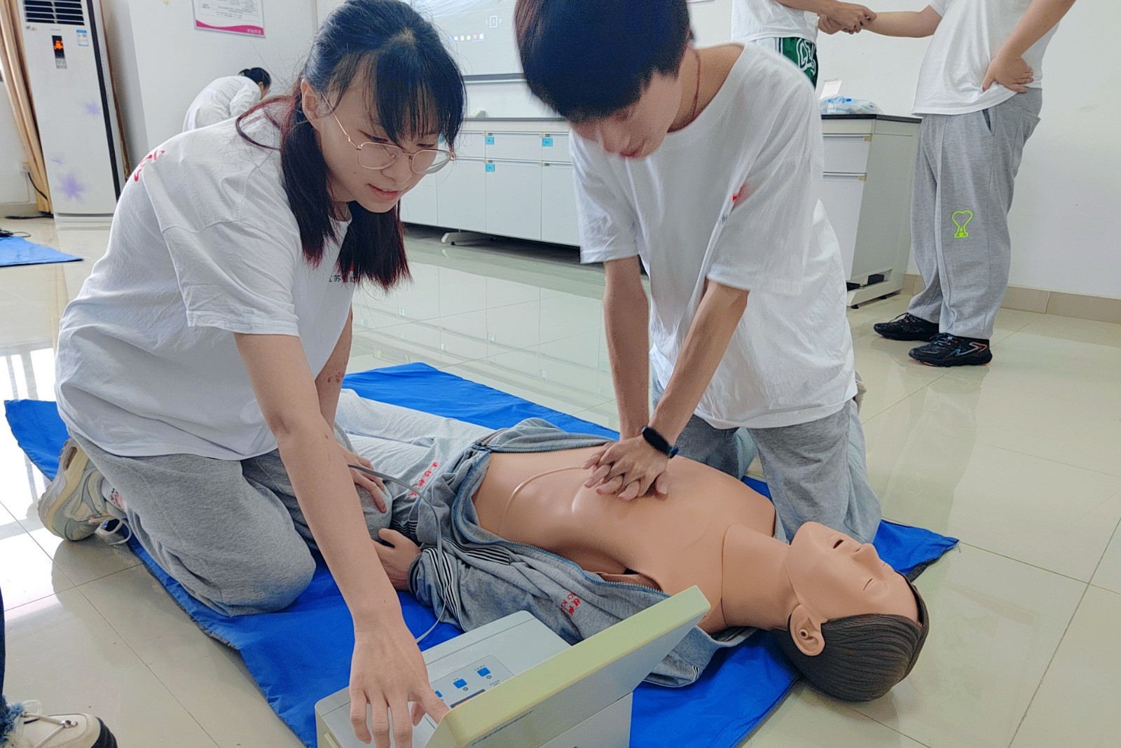 为了帮助患者解决因疾病、意外等原因导致的呼吸、心搏骤停问题,必须紧急采取重建和促进心脏、呼吸有效功能恢复的一系列措施。苏老师组织志愿者们学习心肺复苏ABCD四步法,按照正确操作流程来模拟抢救患者,同时学习AED的使用,从而有效的促进患者心跳的恢复、呼吸功能的重建,保证重要脏器血液供应。