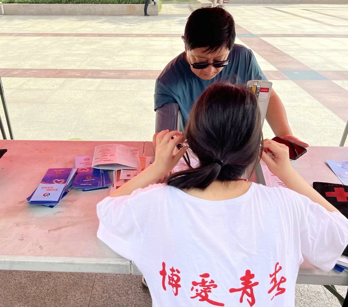 在6月28号下午,南京医科大学康达学院志愿服务队“大爱无声,点亮微光”的红十字志愿者们前往东海县人民广场,为居民科普了造血干细胞以及器官捐献的相关知识,还为每一位前来健身的老人测血压。三名志愿者为一小分队,用通俗易懂的语言介绍什么是造血干细胞移植和器官移植,以及需要注意的事项。