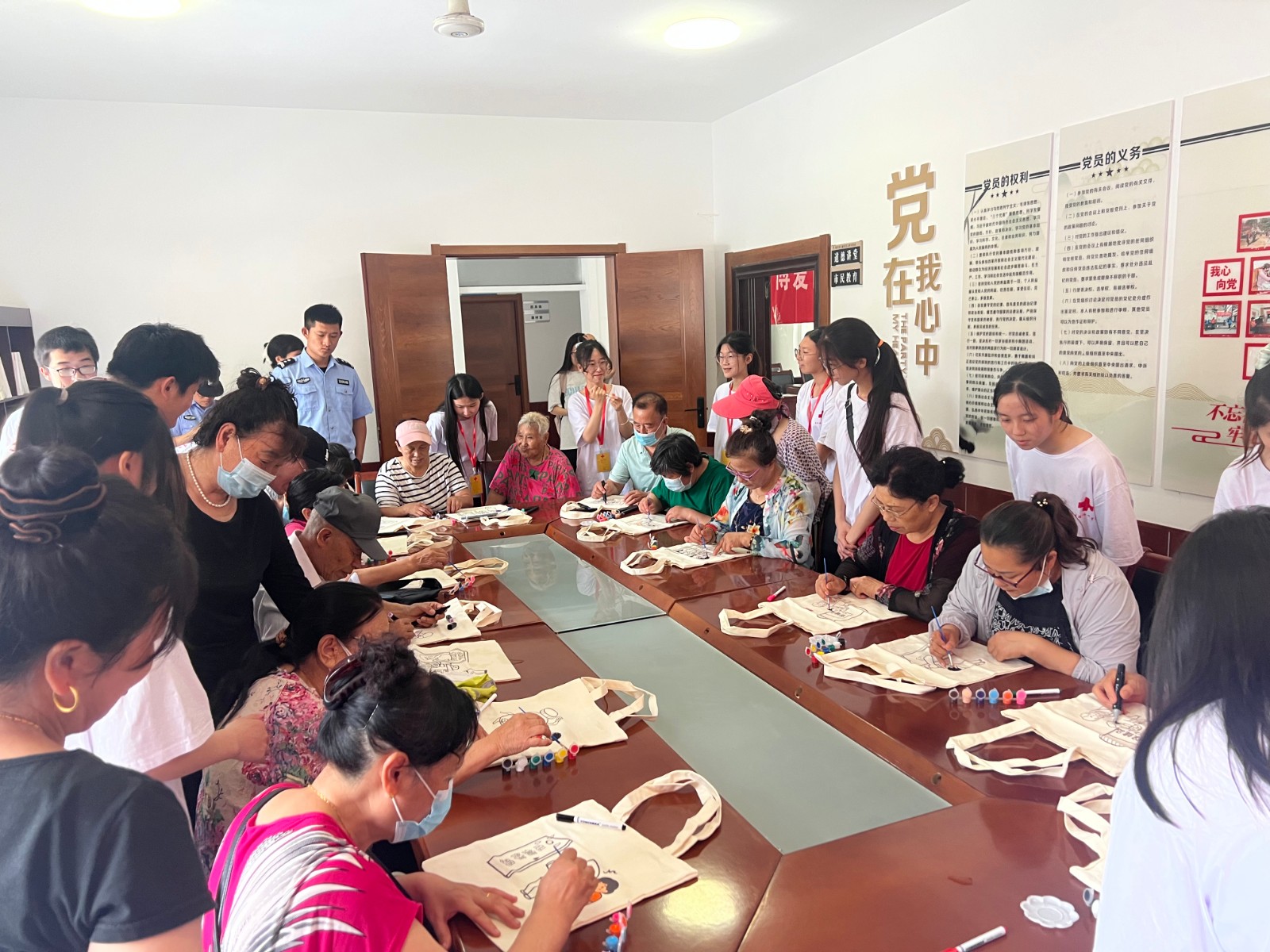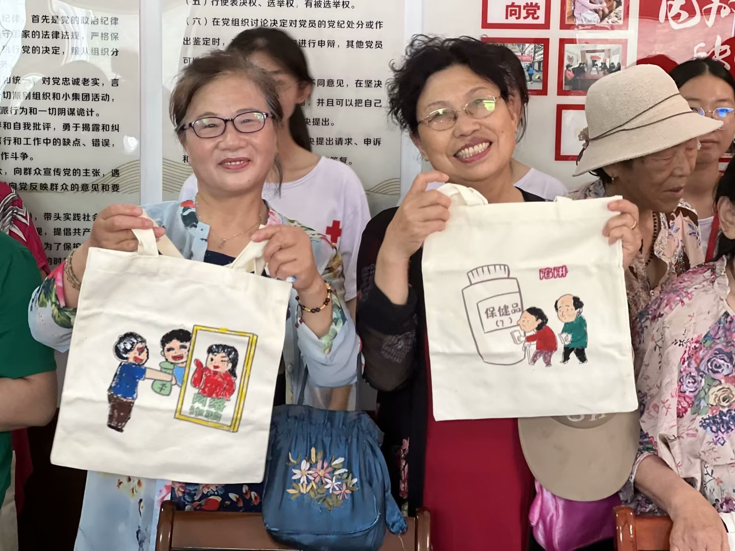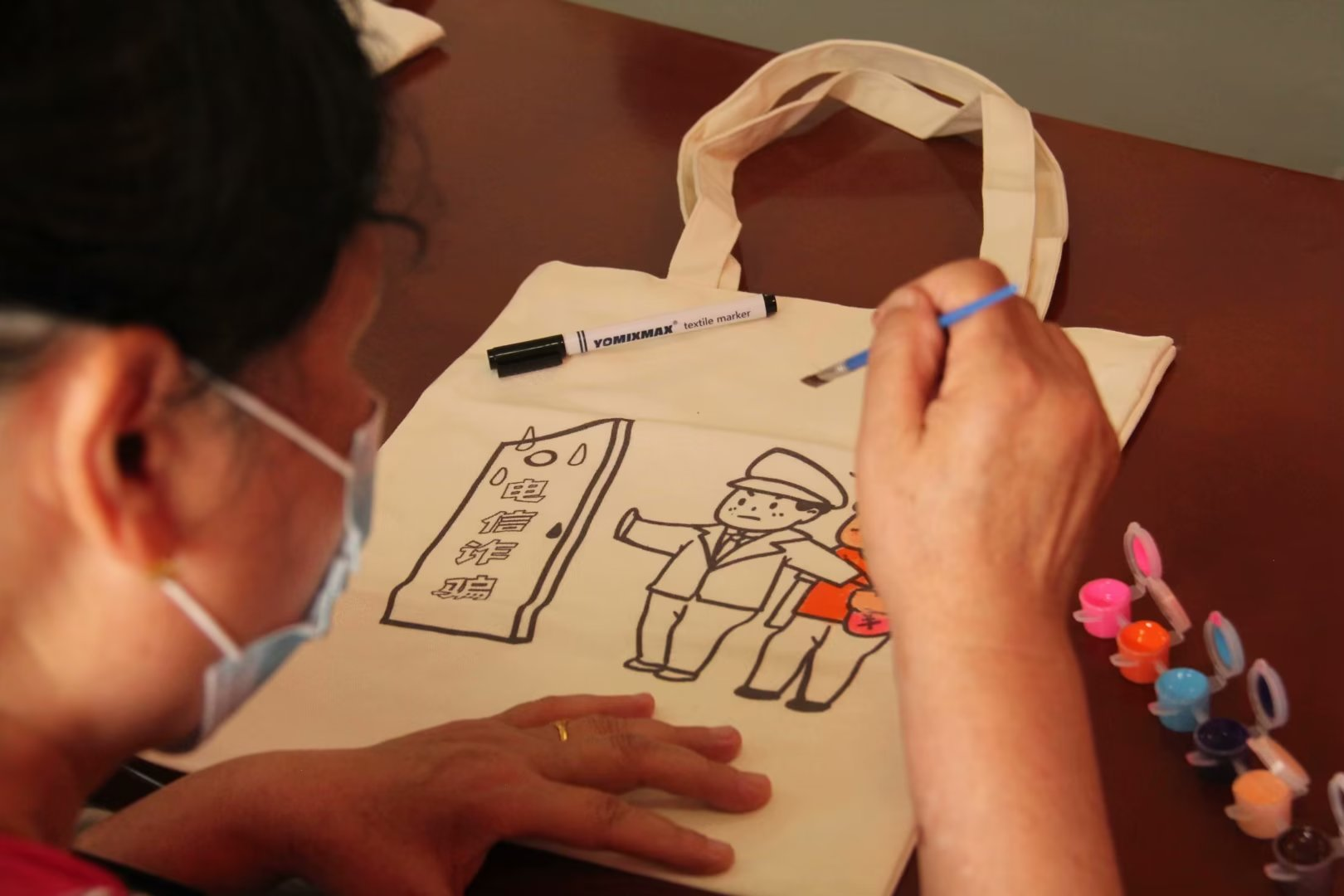 宣讲会最后,志愿服务团队成员们组织所有居民代表进行防诈骗手工DIY活动。居民们结合宣讲会对防诈骗的认识,进行帆布包的二次创作,将防诈骗知识带进生活。