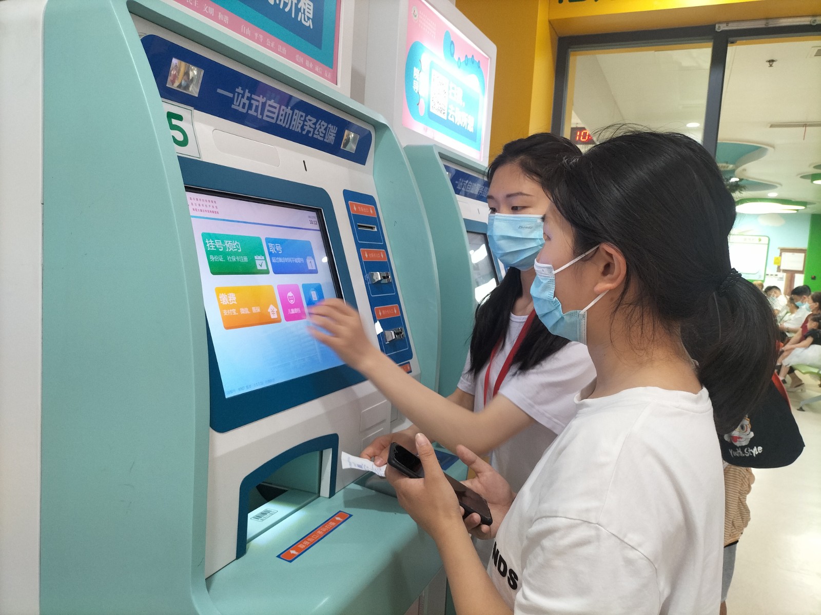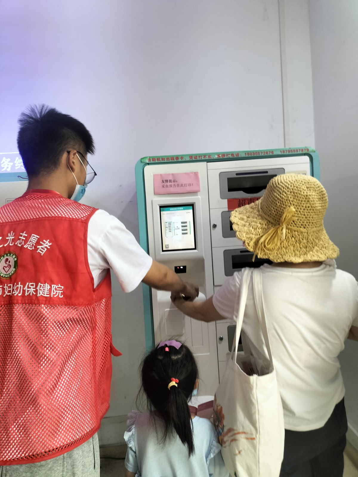 红十字志愿者们分成各组分别在急诊、检测、体检中心、产科、儿科进行志愿工作,共同向医院各处的患者与医护人员提供帮助。在检测中心,红十字志愿者专业地为体检人员测量身高、血压、血糖等,亲切地与之交谈并提出合理建议。在急诊处,红十字志愿者耐心地指导病人进行挂号、缴费、取报告等相关操作,让病人能够迅速熟悉仪器的使用,节省后续的就医时间。在产科、儿科处,红十字志愿者为护士书写登记表、记录病症等基本的文书工作,协调医疗服务,让医护人员能够更好地为小朋友提供高质量的医疗护理和关怀。最后“关爱弱势群体,共筑温暖之家”暑期社会实践全体成员在医院大厅进行合影,结束半天的志愿工作。