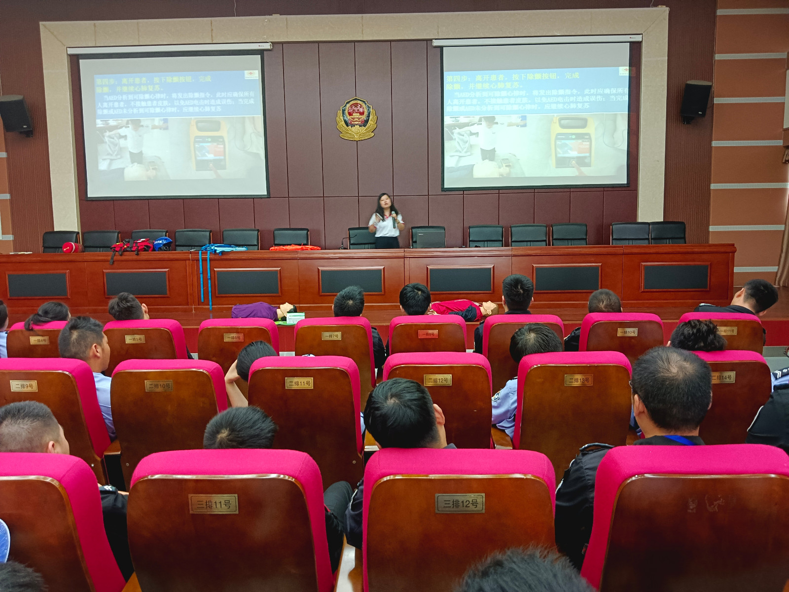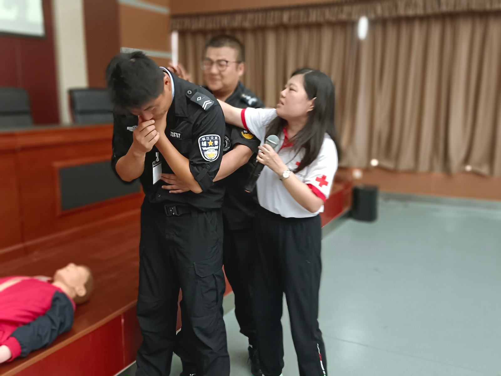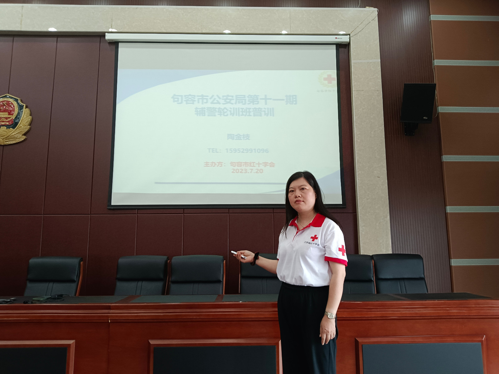 7月20日上午,红会讲师陶金枝来到全市公安机关警务辅助人员全员轮训班第11期轮训现场,向参训人员讲解红十字急救知识,面对面地传授应急救护技能。